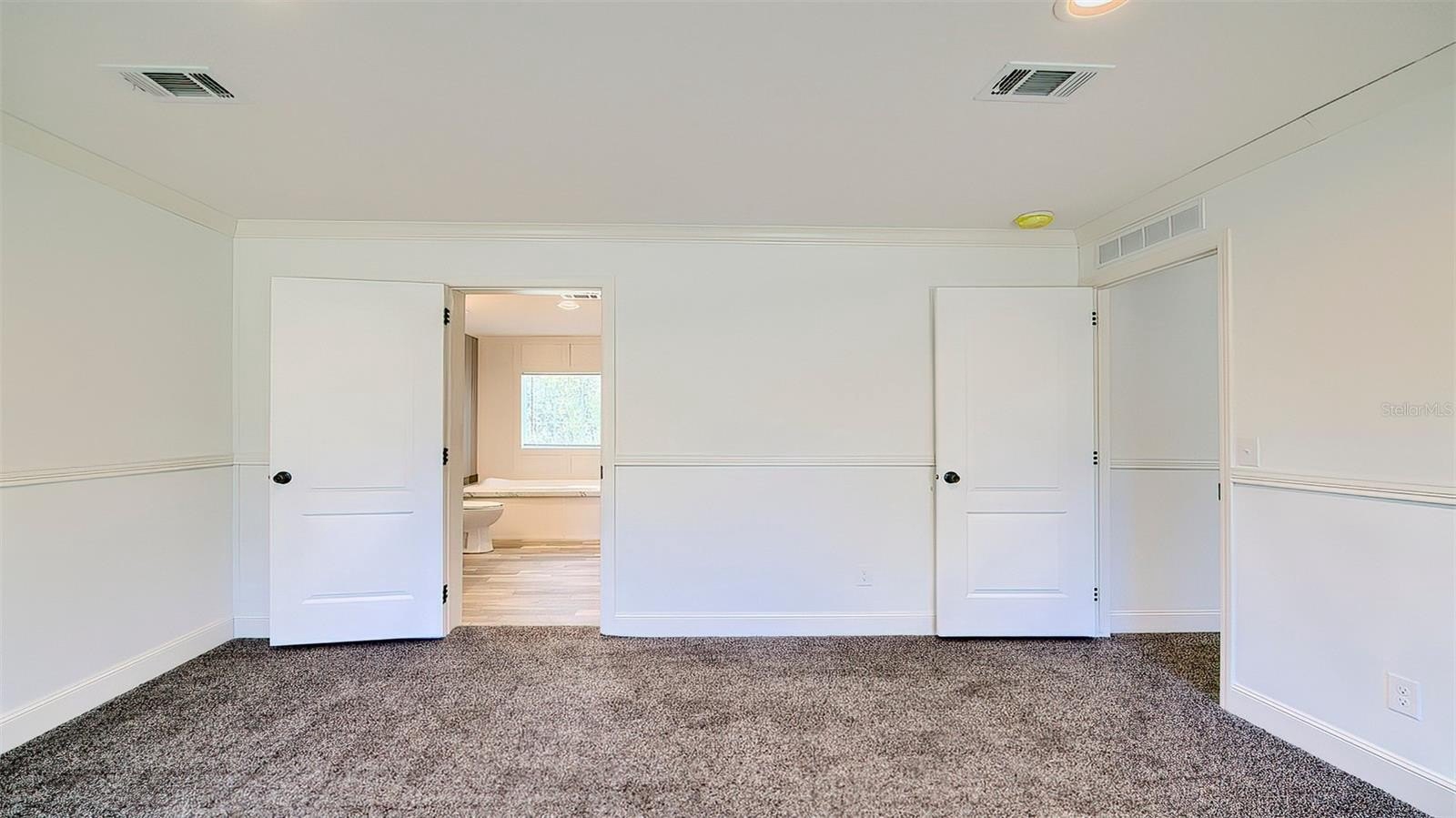 The owner’s suite features plush carpeting, a generous walk-in closet, and a luxurious en-suite bath with dual sinks, a soaking tub, and a separate walk-in shower. Two additional bedrooms and a second full bath provide ample room for family or guests.