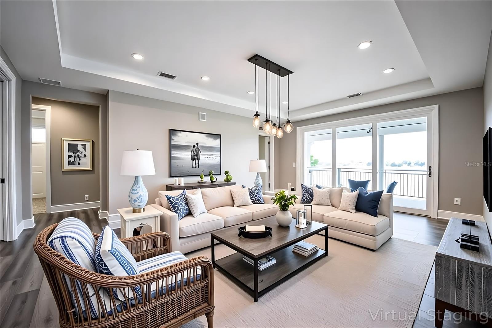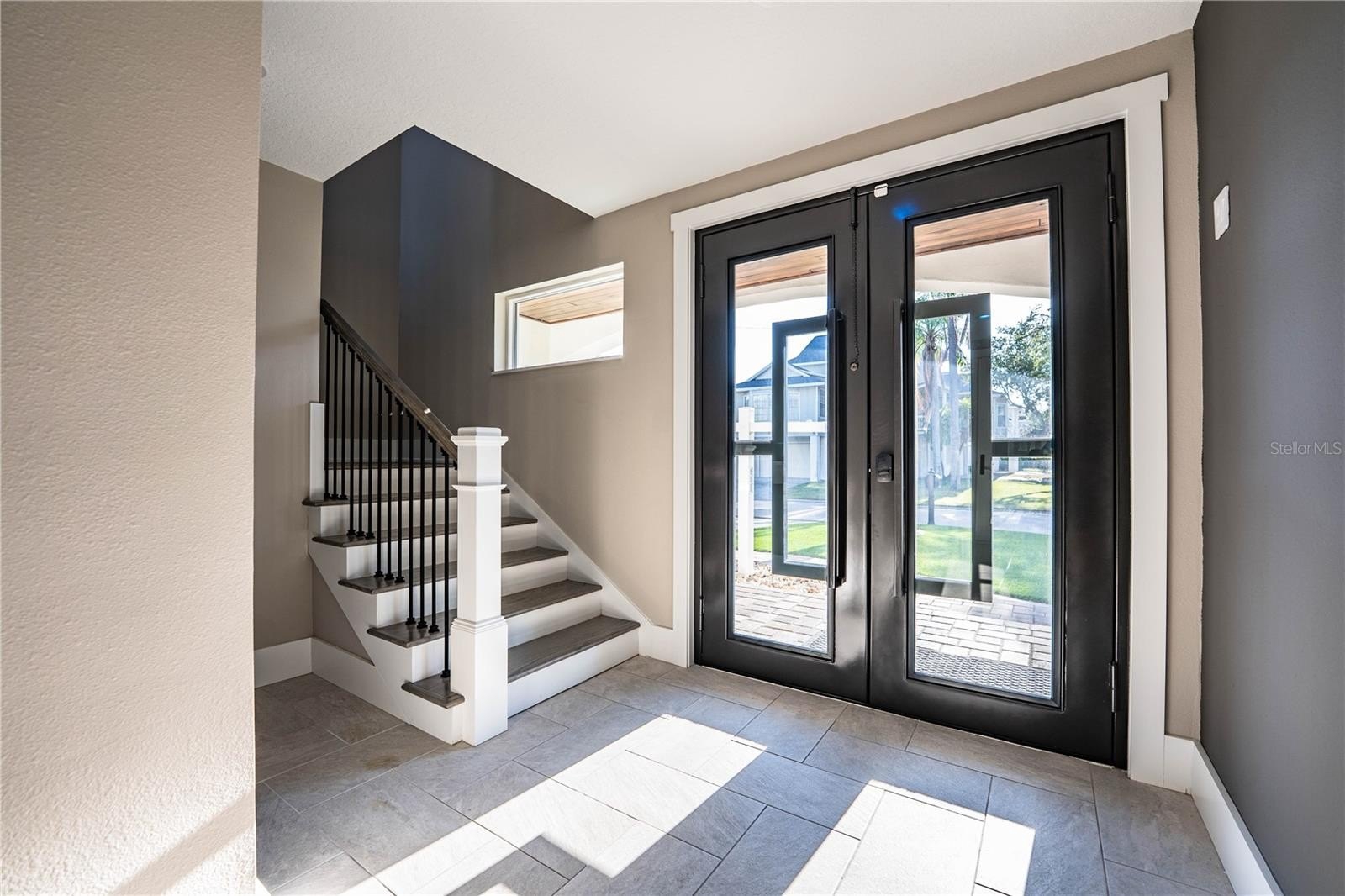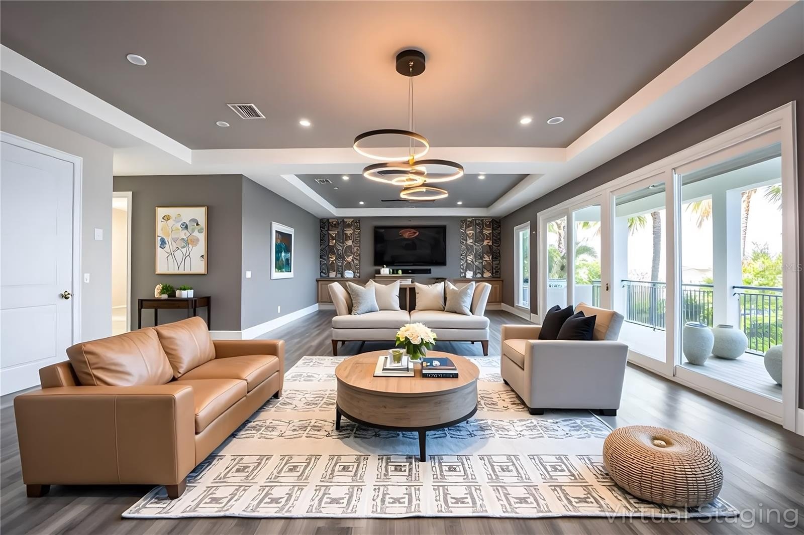 Time to enter through the front door......designer custom steel doors leading to the foyer, additional storage and elevator service. On the 2nd level, the view begins! There's 4-sliders with two 8' high glass panels on both sides, affording a panoramic open-water view of Boca Ciega Bay! To the left you will find a custom wall with a 98" electric fireplace coupled with a 98" TV and a Sonos sound system; this great room is outrageous. In the center of the room, there's ample space for a dining table that seats 8, with a custom contemporary chandelier. Further to the right, is a large kitchen boasting two 10' islands!