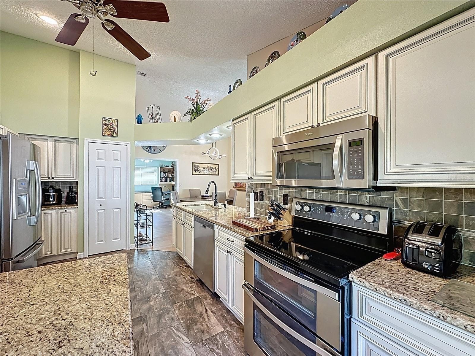 Very nicely updated Canterbury model on the 14th hole of Championship golf course in the 55+ guard gated Kings Ridge community. Home has 1441 SF heated with 2 BD/2 BA, Den and a 2 car garage. The kitchen was remodeled with antiqued wood cabinetry, granite counter tops plus an island for storage & seating. Stainless steel appliances plus newer tile flooring. New HVAC system in 2023 and roof change out in April 2014. New light fixtures in the living room and dining room. In 2024, the flooring was replaced with Luxury Vinyl Plank throughout and high density carpet in the primary bedroom. New thermal pane windows installed in May 2016 thru Window World ( lifetime warrantee) and a new slider in the Primary bedroom. The den/flex room has a built in desk & cabinets that will remain. Newer stacked washer/dryer remain. The primary bathroom has an updated vanity , stone countertop plus extra storage added. Freshly painted interior in 2023 including all doors & trim. The exterior was also painted in 2024. The lanai has been converted to acrylic windows and has Chattahoochee rock flooring. There is a transferrable Stark Termite warranty also. Kings Ridge is a 55 Plus gated golf community located in the rolling hills of Clermont, FL. Enjoy the Royal life style in the multi-million $ clubhouse with 3 heated pools, spas, tennis & pickle ball courts, billiards, shuffle board, shows, Bingo, cards and clubs galore. The monthly maintenance fees include: lawn maintenance including trimming of shrubs, care of irrigation system & irrigation water, internet & TV thru Opticaltel, maintenance of roads and outside painting of home every 7 years. Take your golf cart to the Kings Ridge Plaza where you can do your grocery shopping, banking or dine out.