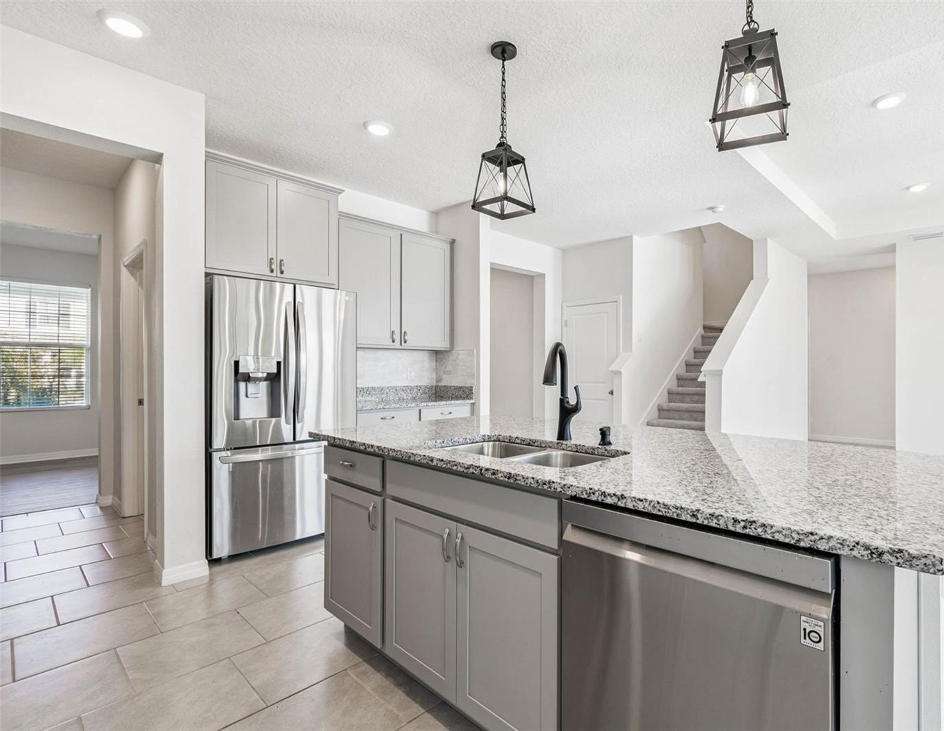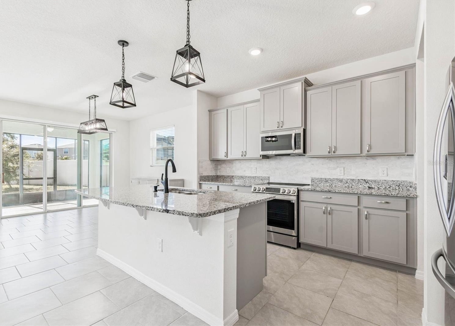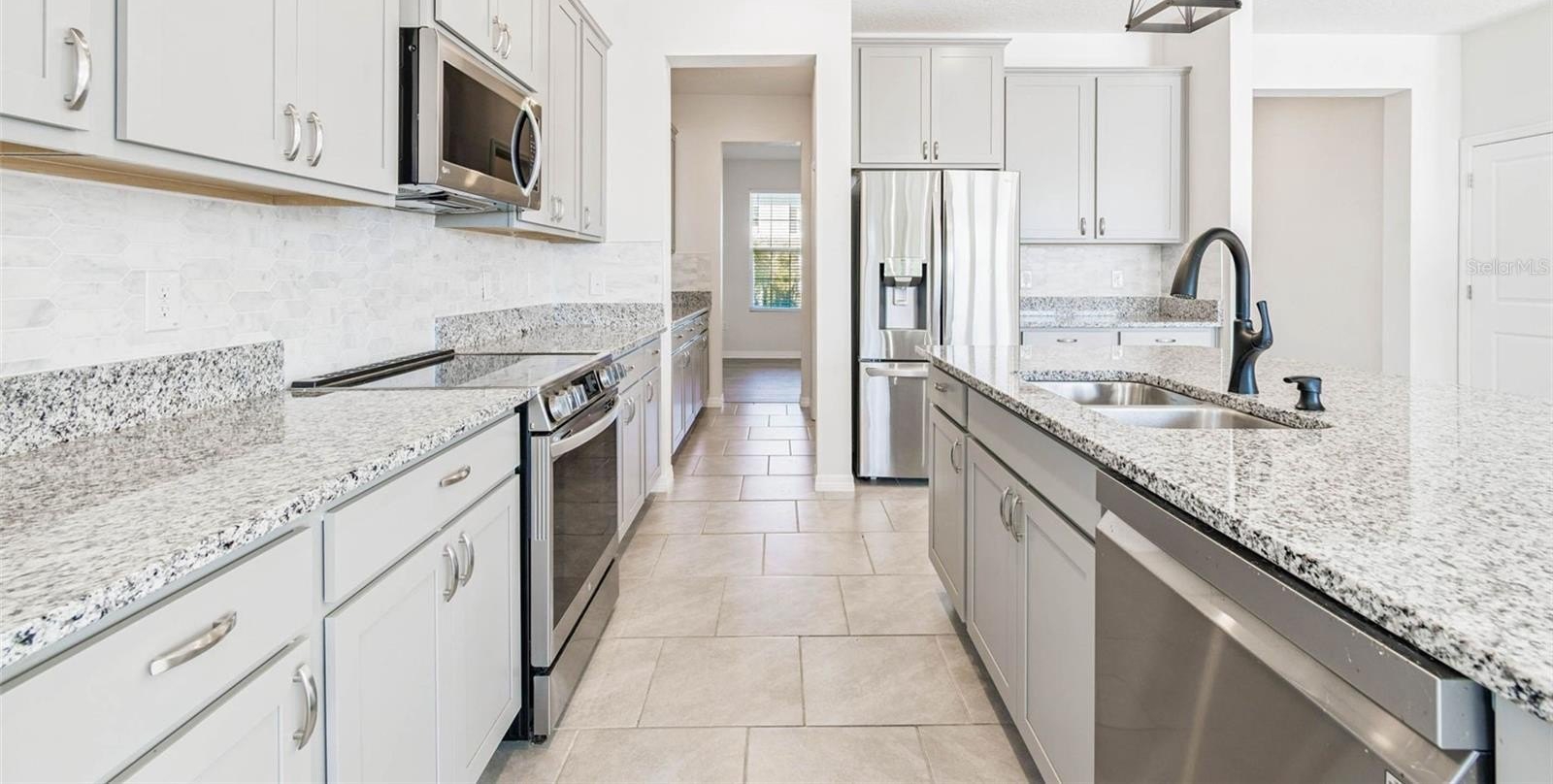 Step inside to a bright, open-concept layout designed for effortless living and entertaining. The spacious living, dining, and kitchen areas flow seamlessly together, enhanced by elegant ceramic tile and waterproof luxury vinyl flooring throughout the main level. The gourmet kitchen is a showstopper featuring granite countertops, stainless steel appliances, and elegant gray wood cabinetry. A large center island offers additional seating, generous prep space, and serves as the perfect gathering spot for family and friends. You’ll also love the huge walk-in pantry and the convenient butler’s pantry connecting the kitchen to the study—ideal for coffee service, extra storage, or prepping for gatherings. The first floor also features a full bedroom and bath, providing ideal accommodations for guests or multi-generational living. Upstairs, the expansive primary suite is a private retreat featuring a luxurious ensuite bath with split granite vanities, a relaxing garden tub, separate walk-in shower, and a private water closet. Two additional generously sized bedrooms share a full bath with dual sinks and a separate shower area. A large loft with a storage closet offers endless possibilities as a media room, playroom, or fitness area. The laundry room comes with washer and dryer and is conveniently located upstairs adding extra convenience to daily living. Enjoy outdoor living at its best on a charming front porch and a fully vinyl-fenced backyard that sits on nearly a quarter-acre lot—perfect for barbecues, pets, or just relaxing under the Florida sunshine. Mirada is more than a neighborhood—it’s a lifestyle! Home to the largest Metro Lagoon in the country, Mirada features a spectacular 15-acre crystal-clear lagoon with something for everyone—sandy beaches, a swim-up bar, kayaking, paddleboarding, a floating obstacle course, splash park, cabanas, and water slides. Socialize on the lagoon event lawn, explore miles of walking and golf cart trails, or visit the tot lots and dog parks. Conveniently located off State Road 52 and just minutes from I-75, Mirada is close to everything. The Market at Mirada offers a Publix, restaurants, and shops right within the community. Nearby attractions include The Grove, Wiregrass Mall, and Tampa Premium Outlets. With its unbeatable combination of luxury, location, and lifestyle—this Mirada beauty truly lets you live the ultimate staycation every day!