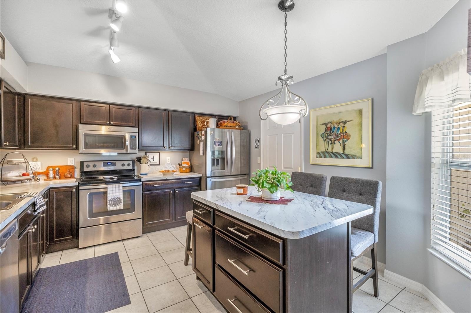 Enjoy easy living in this charming two-bedroom, two-bath townhome located in the desirable Tradition Townhomes community. The stack-stone front, paver driveway, and attached one-car garage create a welcoming first impression, while the open layout and thoughtful design make everyday living effortless. The kitchen features a built-in breakfast bar with extra cabinet and drawer space, perfect for storage and casual dining.