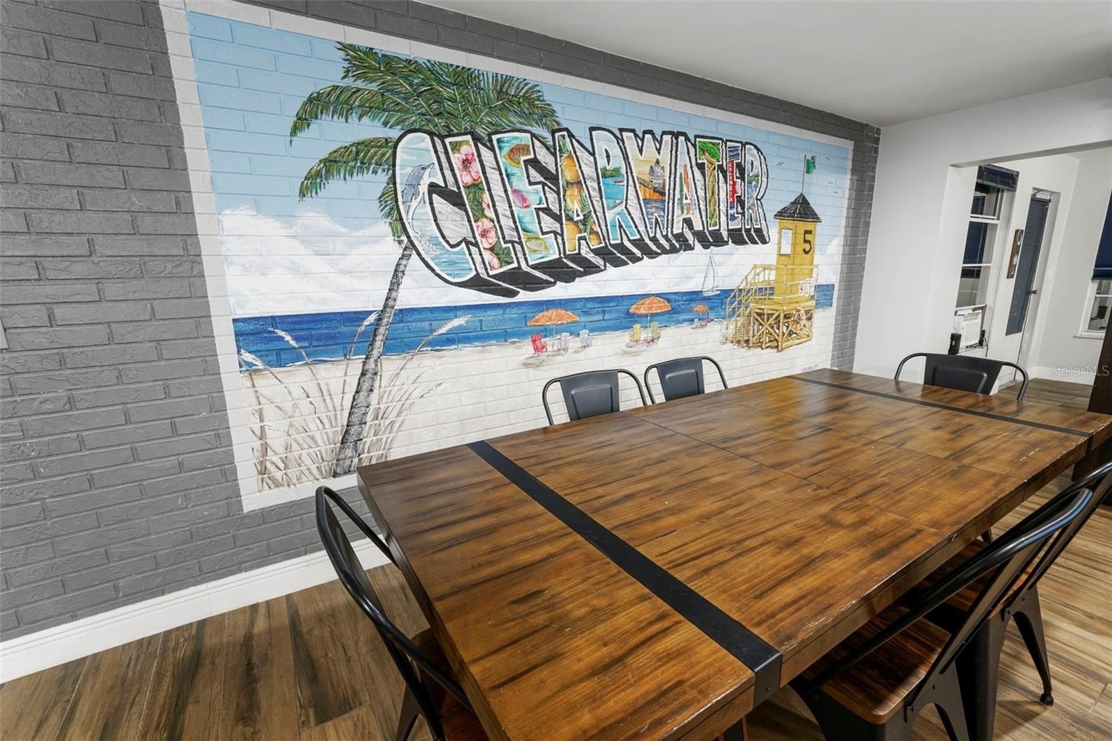 Beautifully Updated 2-bedroom, 2-bathroom home offering over 1,400 square feet of open floor plan living providing a bright, spacious feel. Perfect for entertaining or relaxing. Enjoy the stunning Clearwater Beach mural in the dining area that brings a unique touch of Florida charm. The remodeled kitchen features stainless steel appliances, granite countertops and all wood cabinets. The flooring has been updated to wood plank tile throughout the whole home.
