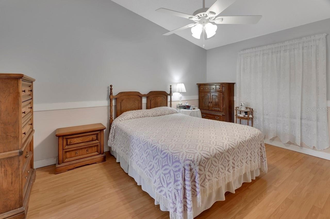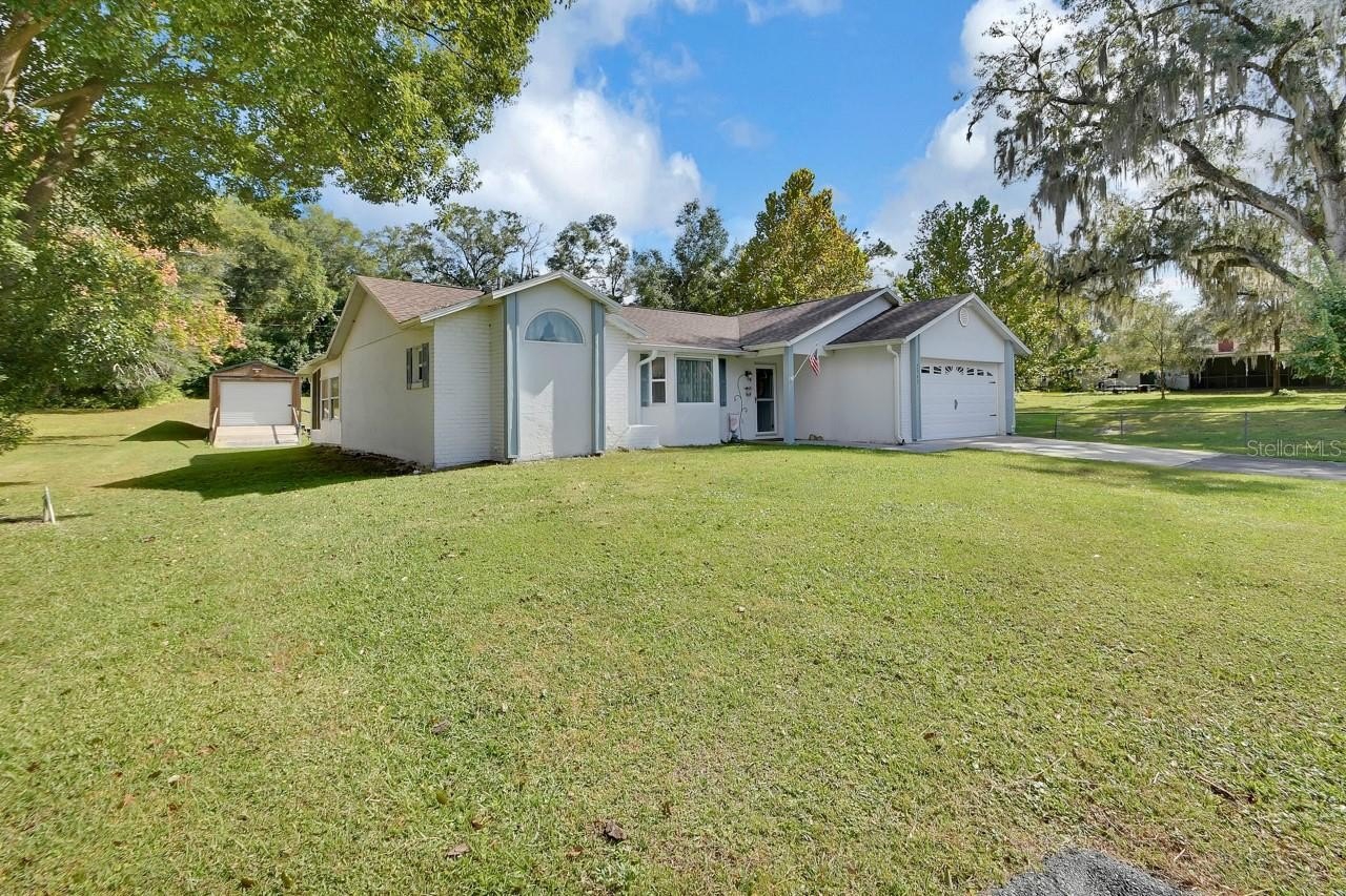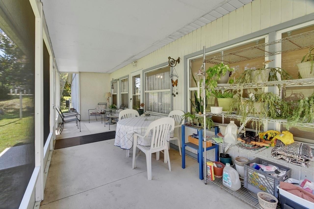 The heart of the home has a beautiful kitchen complete with granite countertops, mosaic black splash, and stainless steel appliances. Sit and enjoy conversation around the breakfast bar or the quaint dinette area. This home could serve as a perfect multi-generational home. A formal living-dining room combination with a split plan with primary on one side and French doors accessing the Florida room, while on the other side of the home there are 2 additional bedroom just off the family room with French doors that lead out to Florida room, and has additional storage with beautiful hardwood built in lower cabinets. There is wood laminate floors through out the home, with tile in the wet areas. There is indoor outdoor carpet in the 10 x 28 Florida room. The laundry room in inside. From the Florida room step out to a screened in 7 x 27 back porch.