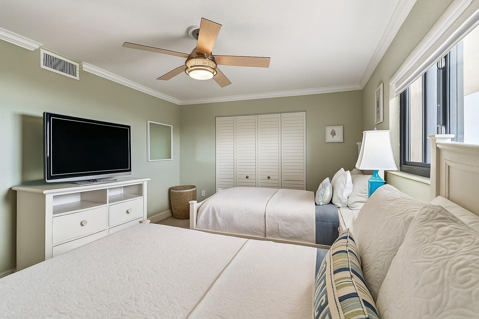 The primary suite is your private retreat with a balcony access and Gulf views, custom walk-in closet, and a renovated ensuite bathroom with dual granite vanities and elegant finishes. The guest bedroom offers peaceful Intracoastal views and access to a stylish updated guest bath. A new AC unit (2025) and in-unit laundry add comfort and convenience. This condo also includes a private storage unit, perfect for beach gear, bikes, or seasonal items—adding valuable space and convenience.