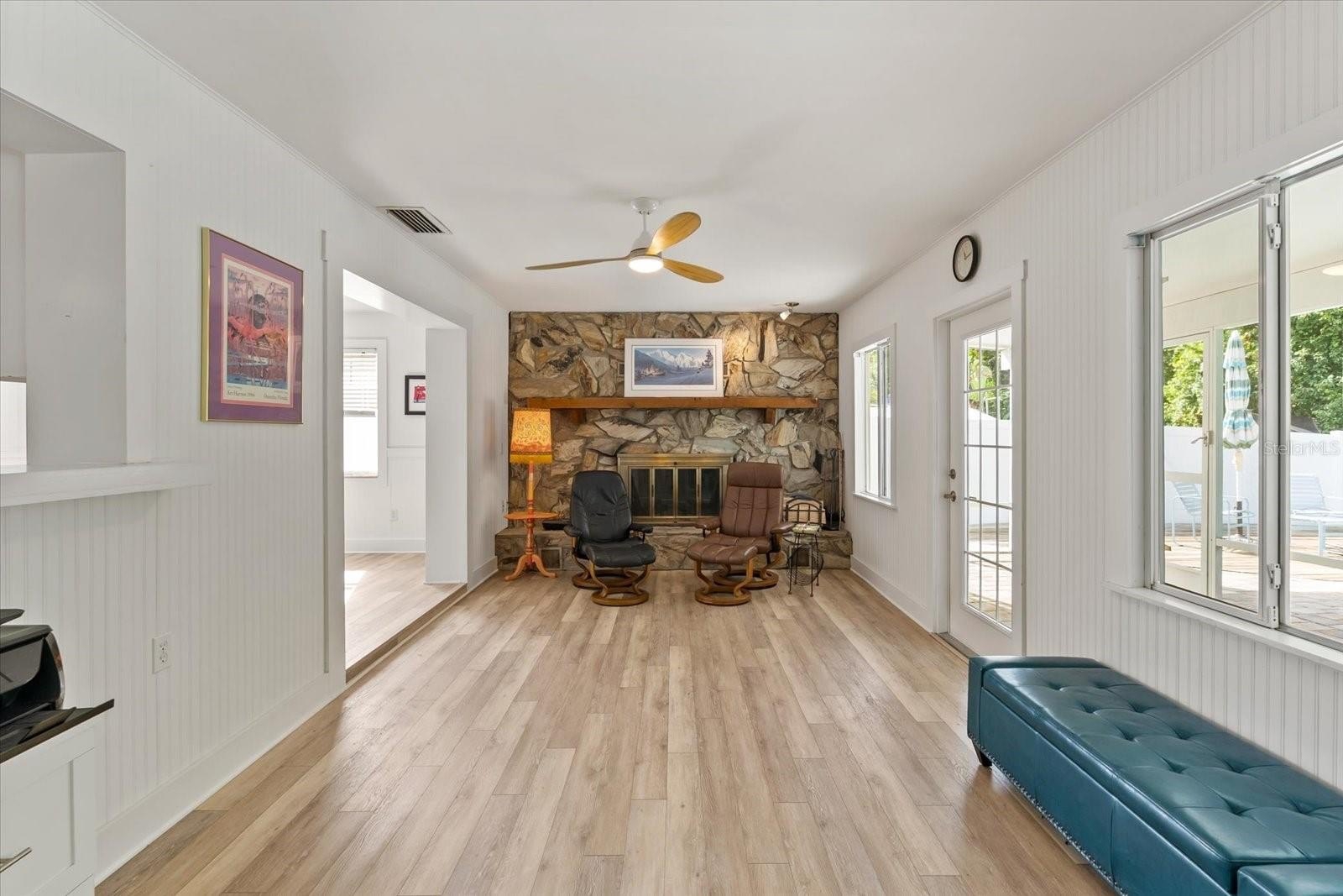 A whimsical mid-century escape in the heart of Dunedin! Adjacent to the peaceful trails of Hammock Park, this mid-century modern treasure feels like something out of a storybook. With over 1500SF of sunshine-filled living space, this 2 bedroom, 2 bath retreat blends artistic charm with everyday comfort. Inside you will find open airy rooms with luxury vinyl flooring, two updated bathrooms, and a spacious eat in kitchen that just begs for morning coffee and easy Sunday breakfasts. The wood burning fireplace in the family room adds a cozy glow on cooler nights, while the huge picture window in the living room perfectly frames the sparkling pool and leafy views beyond. Step outside and feel the magic of a shimmering pool, two expansive wood decks, and brick pavers that set the scene for sunny afternoons and laid-back evenings with friends. The fully fenced yard means your furry companions can roam freely in "Dogedin", one of Florida's most pet-loving towns. Practical comforts are all here too: New roof (2024), Electric water heater (2019), Central AC (2017), Hurricane shutters, Upgraded ceiling fans throughout and the peace of mind that comes with being outside the flood zone and untouched by storms. Best of all, you are just a short stroll from the Dunedin Fine Art Center, the Pinellas Trail and all the creative energy that makes this little coastal town so special. This is more than a home...it is a vibe. A place where art, nature and good company come together under the palms.