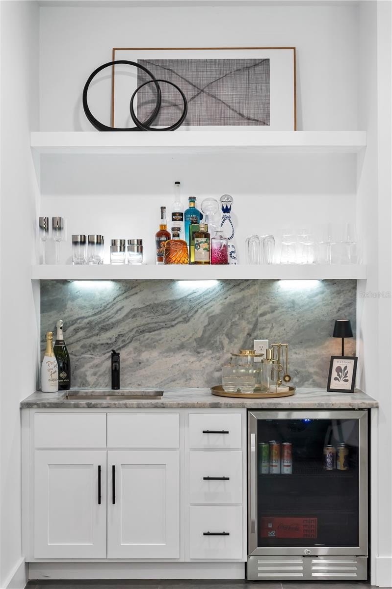 At the heart of the home, the gourmet kitchen features a 10-FOOT WATERFALL QUARTZ ISLAND, Bosch APPLIANCES including DUAL REFRIGERATOR-FREEZERS, induction cooktop with pot filler, convection oven, microwave, dishwasher, WALK-IN PANTRY, and a DEDICATED COFFEE BAR OVERLOOKING THE POOL.