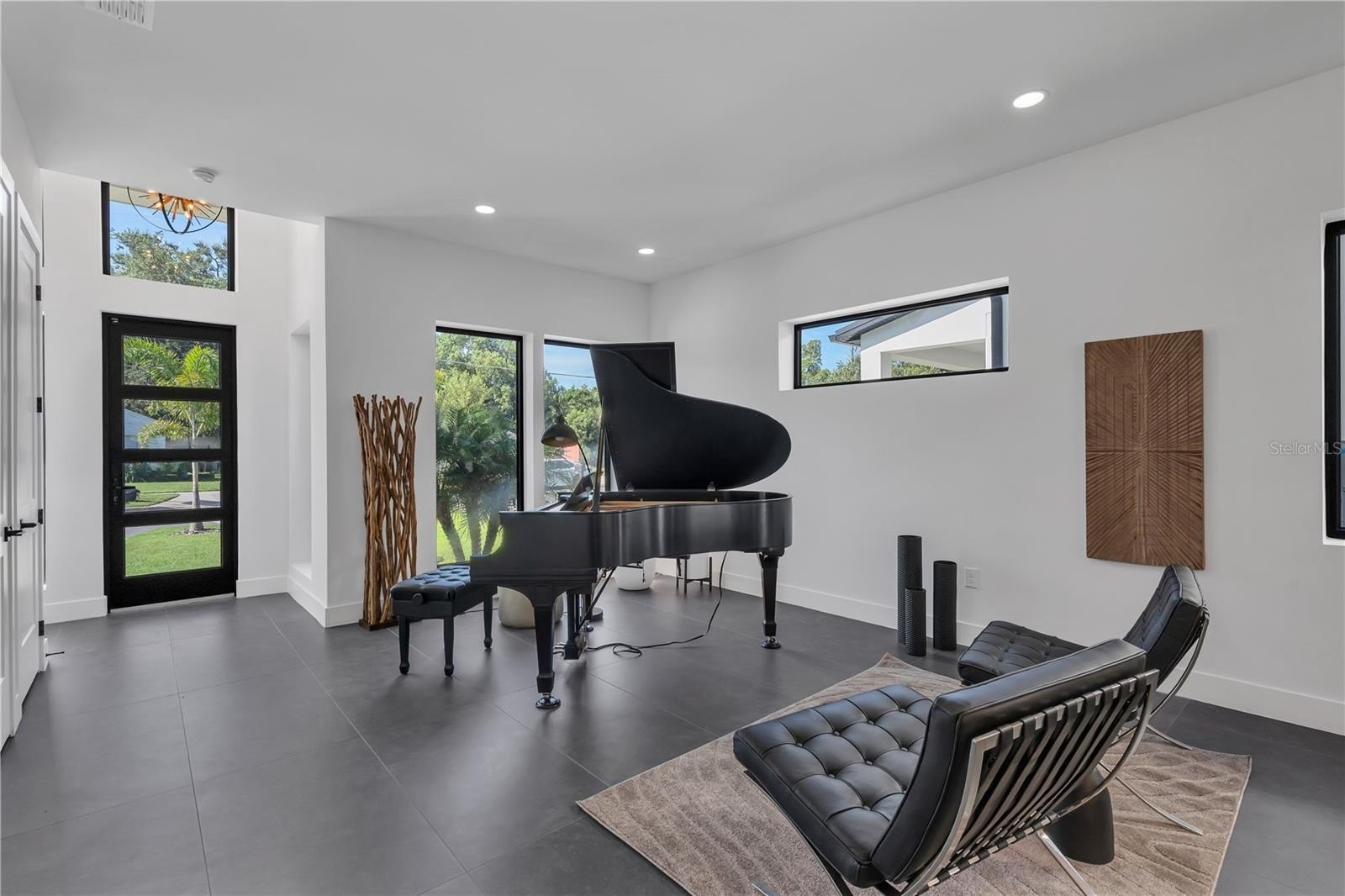 The main residence opens with a SOARING 24-FOOT FOYER that sets the tone for its contemporary scale, natural light, and modern refinement. The main level includes FLEXIBLE SOCIAL AREAS, a formal dining room, and a living space anchored by a MODERN ALL-SEASONS FIREPLACE, CUSTOM SHELVING, WET BAR, and INTEGRATED SOUND SYSTEM.