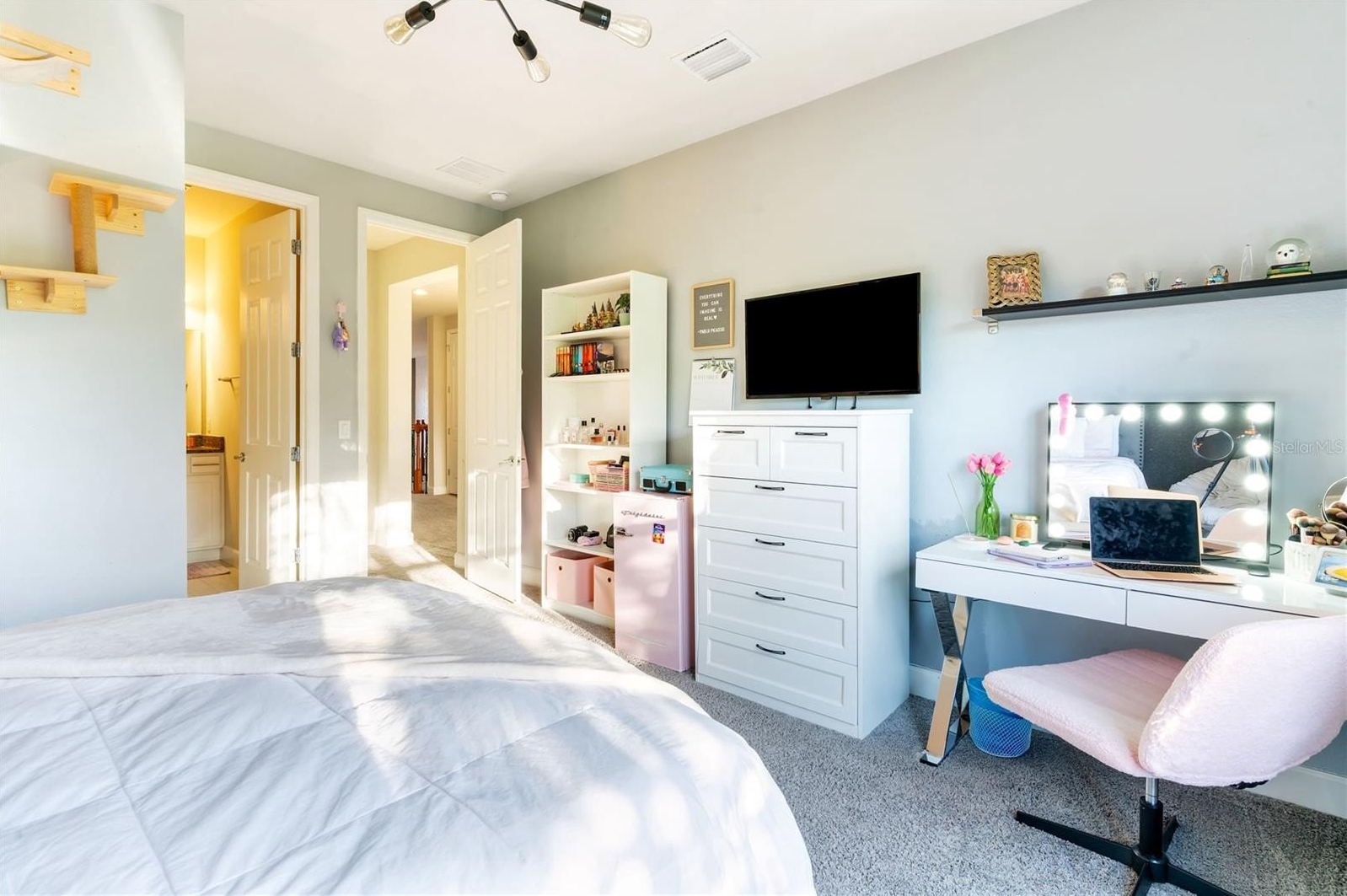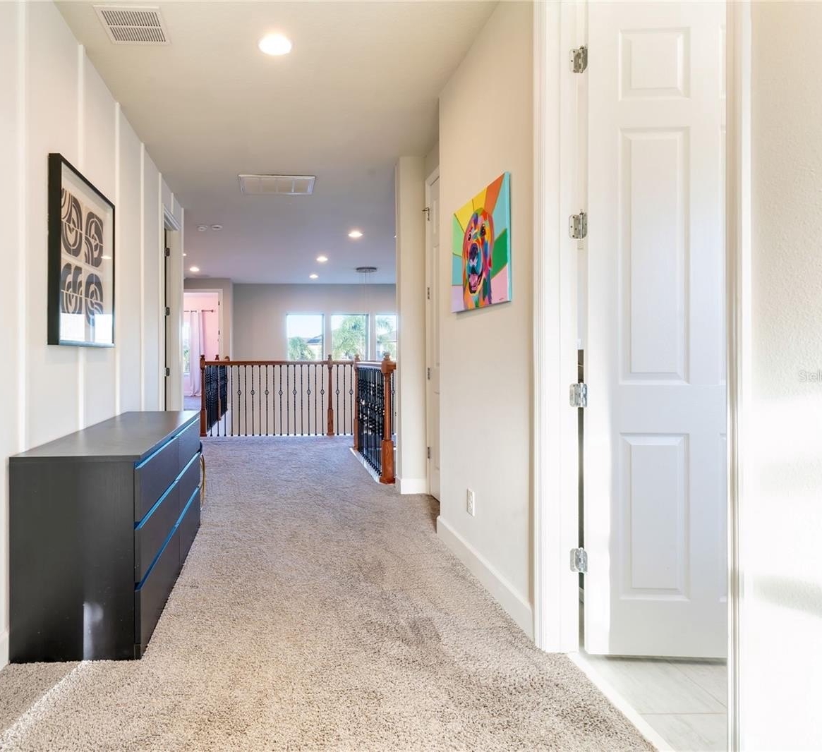 The additional three bedrooms are comfortably sized and share well-appointed bathrooms. One of them is a suite with a walking closet with direct views of Disney’s nightly fireworks. The are multiple storage areas located throughout this floor.