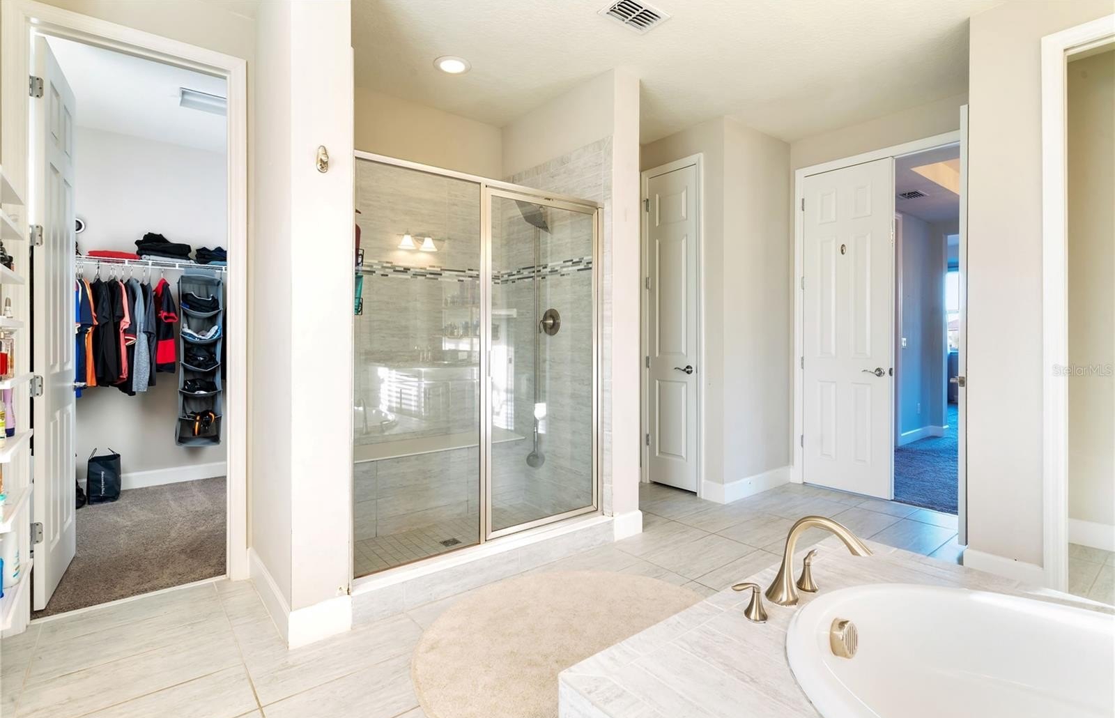 Upstairs, the primary suite is a true retreat: a private area with dual walk-in closets, a separate soaking tub and glass-enclosed shower, and a cozy nook for relaxation or reading.