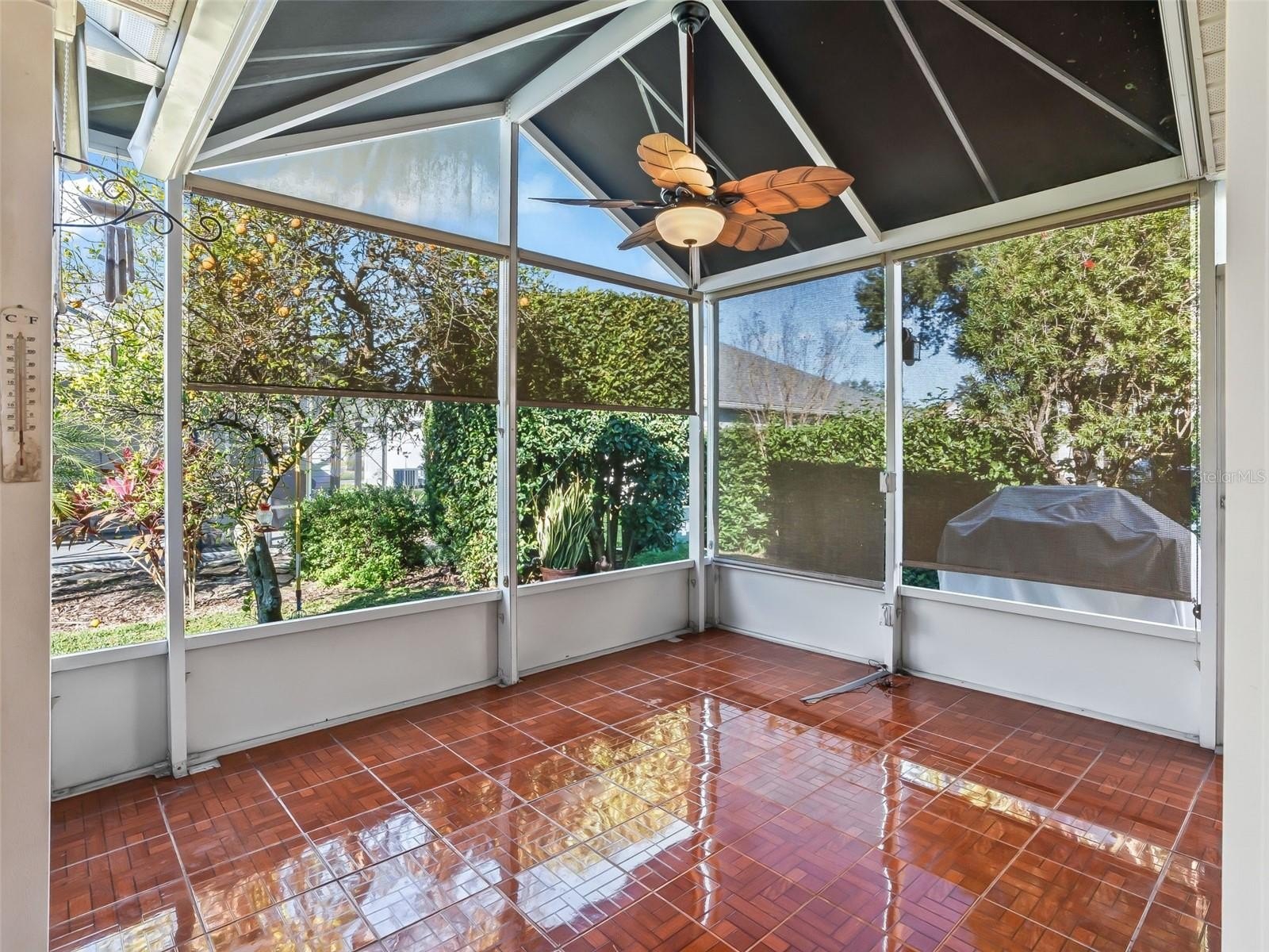 Enjoy privacy on the covered and screened sun porch, surrounded by mature landscaping and a lemon tree that provides an abundance of fresh lemons. The garage is equipped with decorative flooring, built-in closets and extensive shelving, offering exceptional storage.