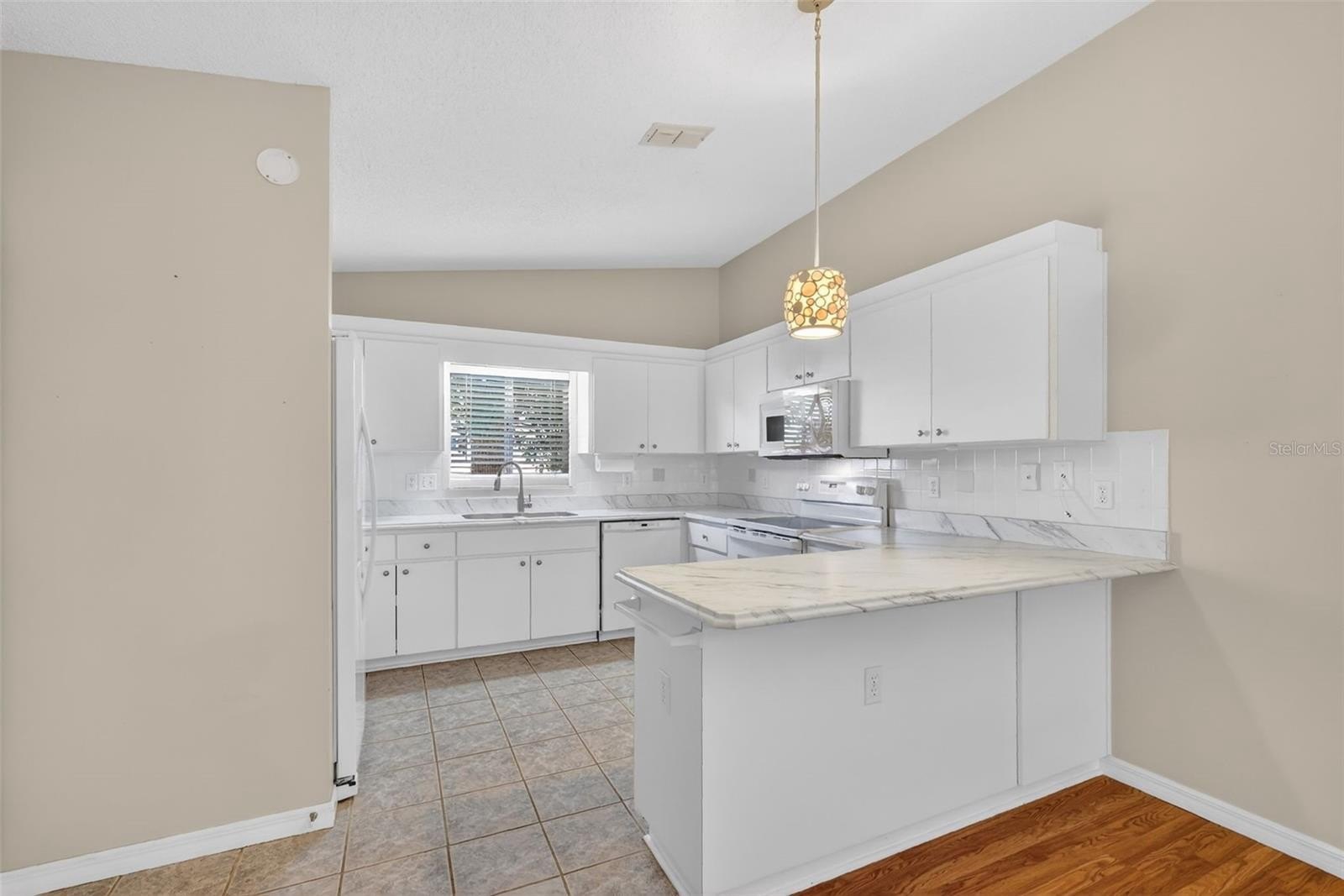 Discover your FOREVER home in Spruce Creek South!!!This MOVE IN READY 3/2 DOGWOOD model with an expanded Lanai has GLASS WINDOWS and is under HVAC. A Welcoming FRONT PATIO sets the tone for a warm feeling throughout this lovely home. The KITCHEN has plenty of WHT CABINETS with Pull Out Drawers, Newer Appliances, Stylish Countertops, Updated light and Tile Floor! In the Main Living areas you will find WOOD LOOK LAMINATE,An ANGLED CEILING with a SKYLIGHT providing NATURAL LIGHT ,CEILING FANS and LIGHTING. THERE ARE NO CARPETS IN THIS HOME!!!!Throughout the home there are Ceiling fans for COMFORT.One of the Guest Bedrooms has BOOK SHELVES conveniently BUILT IN.