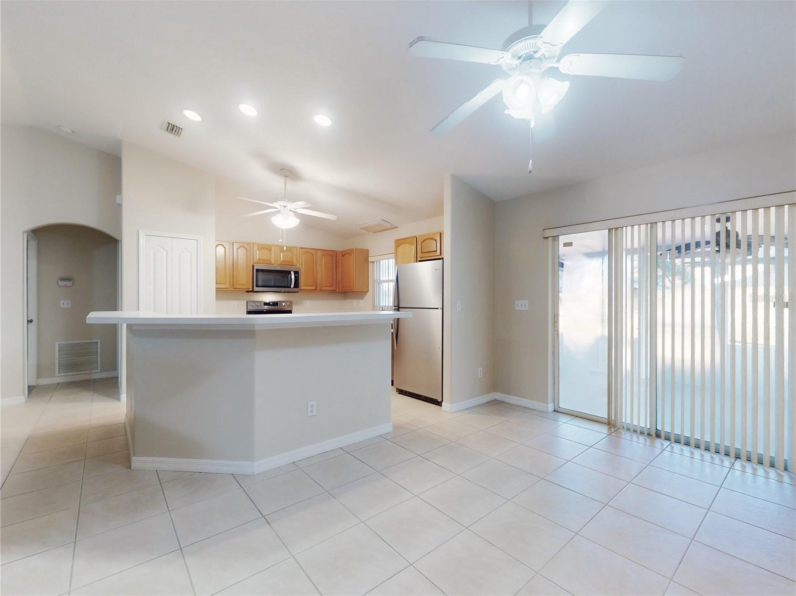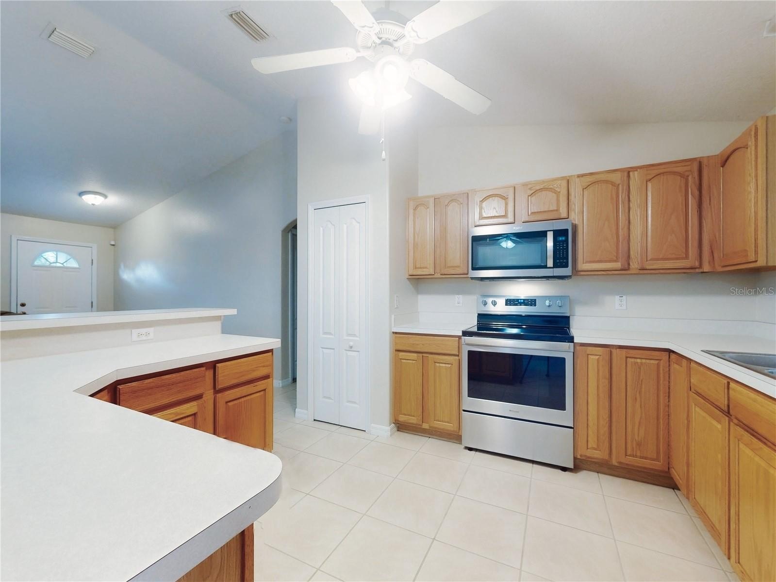 The bright kitchen features solid wood cabinetry and stainless steel appliances (new in 2020), perfectly positioned for everyday living and entertaining. The split-bedroom layout ensures privacy, and the primary suite boasts a spacious walk-in closet and a well-appointed bathroom.