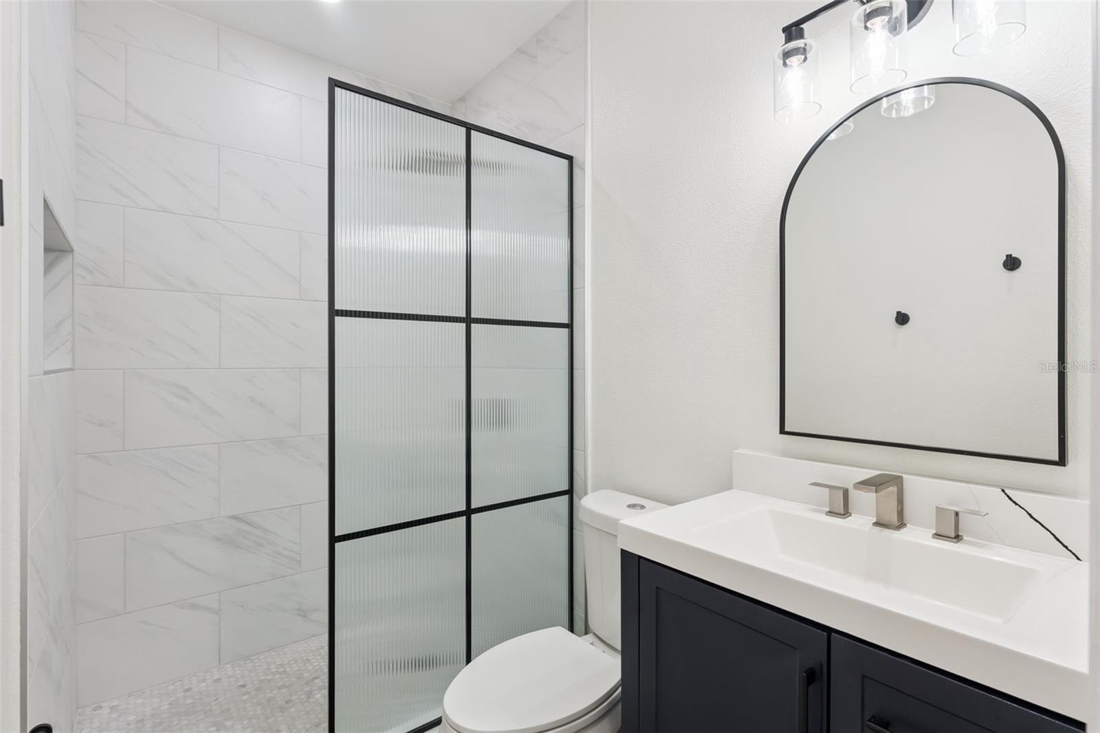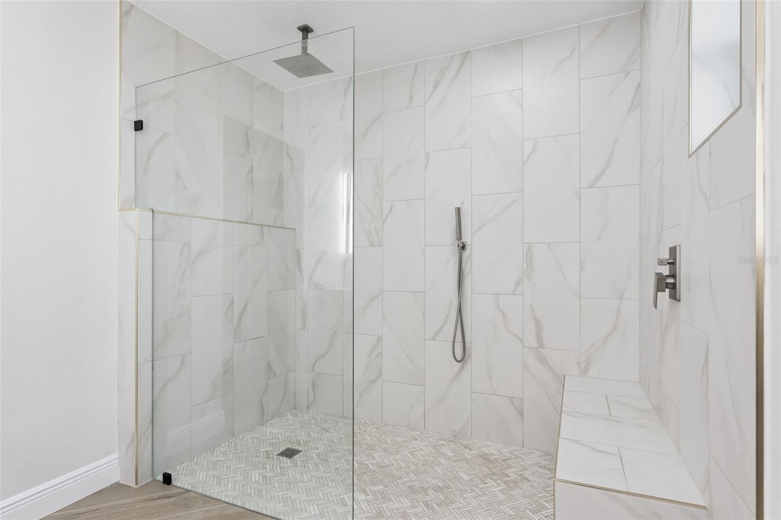 The fully updated primary bathroom features double vanities, a large walk-in shower with dual shower heads, and a very spacious walk-in closet.