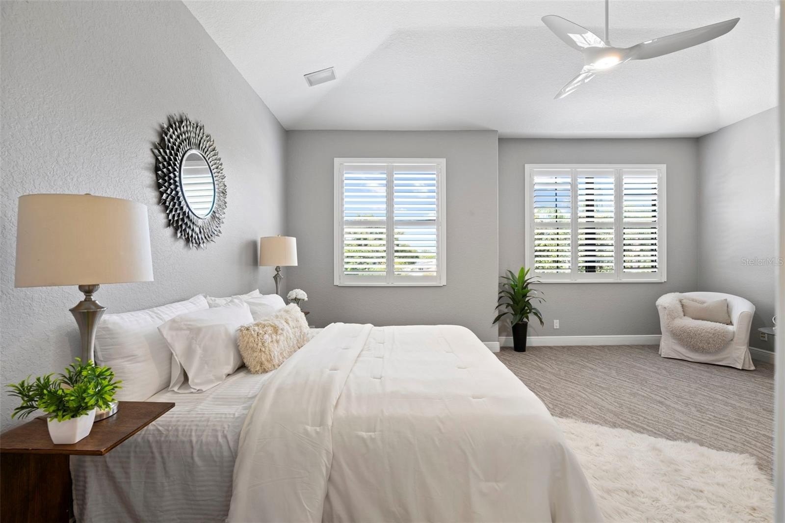 The extra-large master suite is a luxurious retreat, featuring an en suite bath with a step-in shower, separate garden tub, and a private water closet. There's ample room for a seating area, and the professionally organized walk-in closet provides exceptional storage. This home was designed with the option to install an elevator if needed, or you can use the stacked closets for additional storage. It offers the convenience of a washer and dryer on both levels, complemented by upgraded window treatments, including plantation shutters, and modern light fixtures. Additionally, the property includes a First American Home Warranty and home automation features. The very large garage offers ample space for all your storage needs.