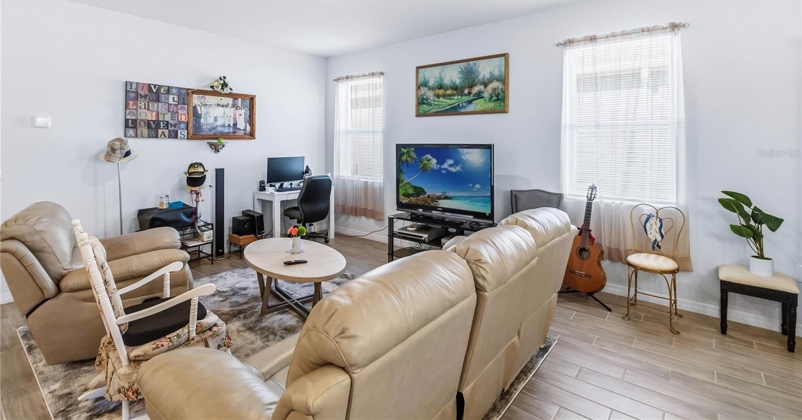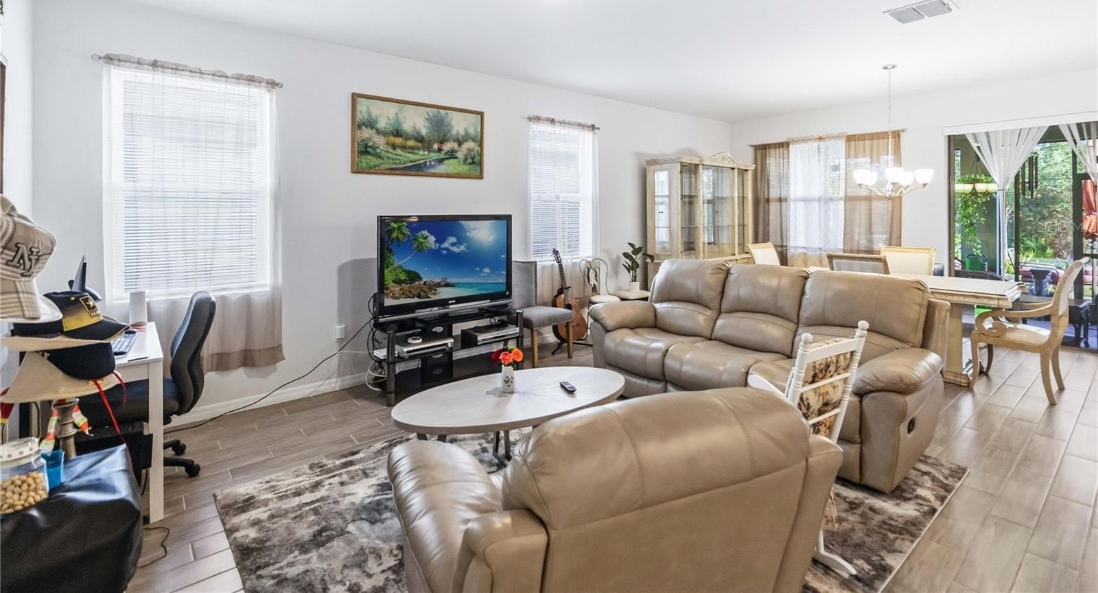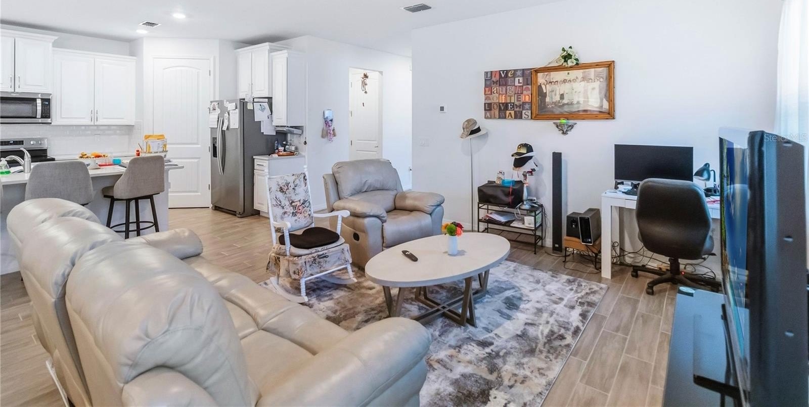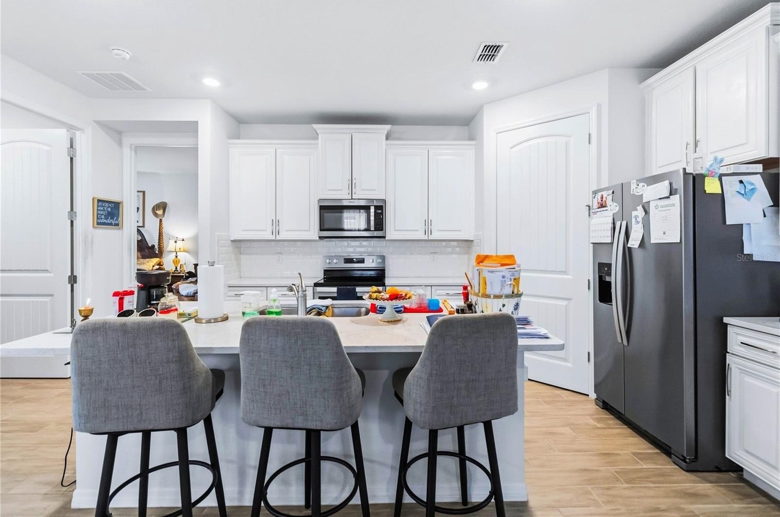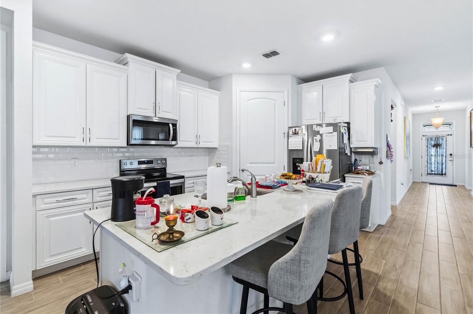 Conservation and pond views welcome you in this like-new two-bedroom plus den retreat, thoughtfully designed and tucked inside the gated 55+ community of Palms of Serenoa. From the moment you step inside, the open layout feels bright, welcoming, and effortlessly livable. The smart home features a beautiful kitchen with crisp White cabinetry, stainless steel appliances, an oversized island perfect for gathering, and a generously sized pantry that keeps everything neatly in its place.