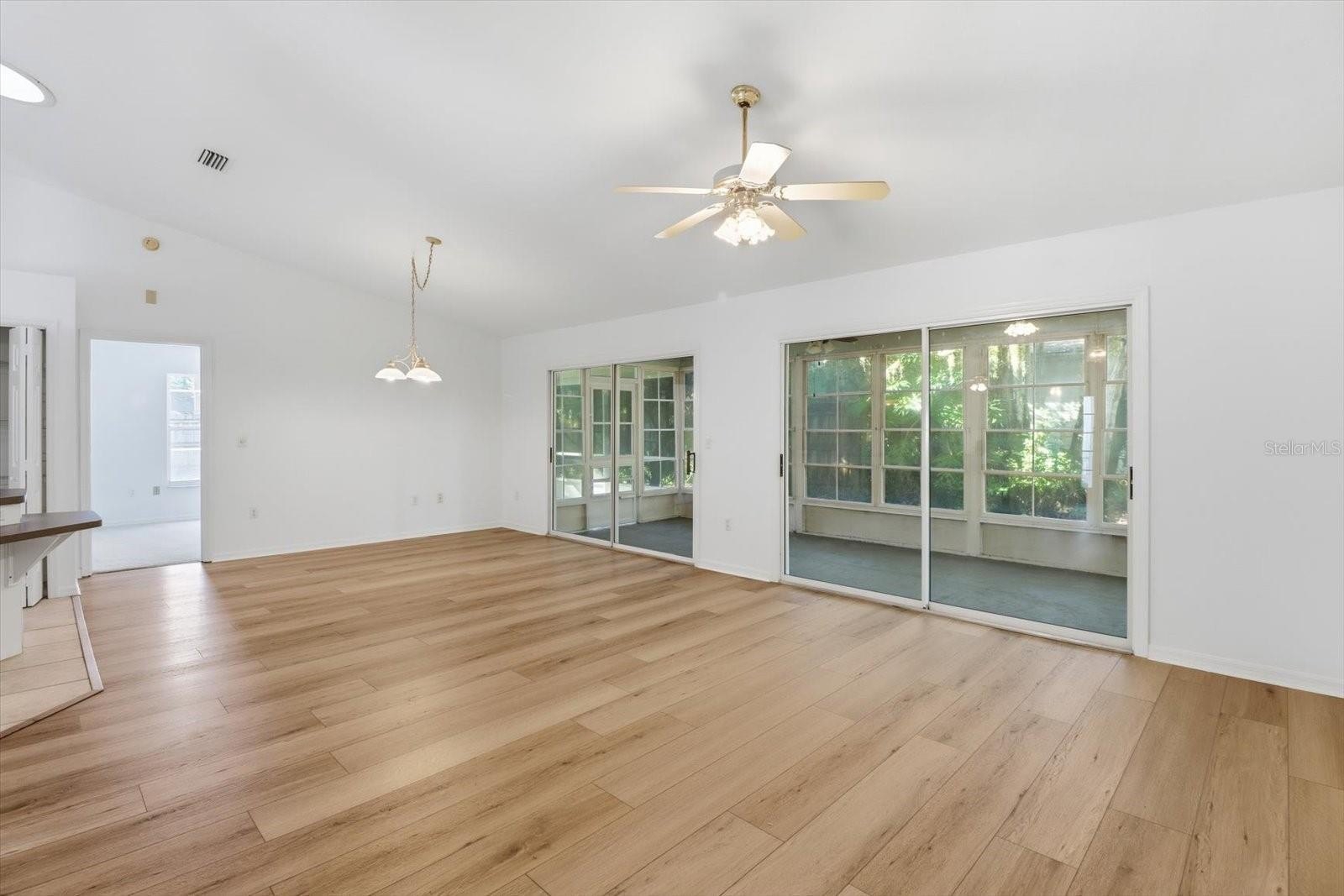 The Dining Room and Living Room have beautiful luxury vinyl plank flooring and include sliders to the enclosed Lanai