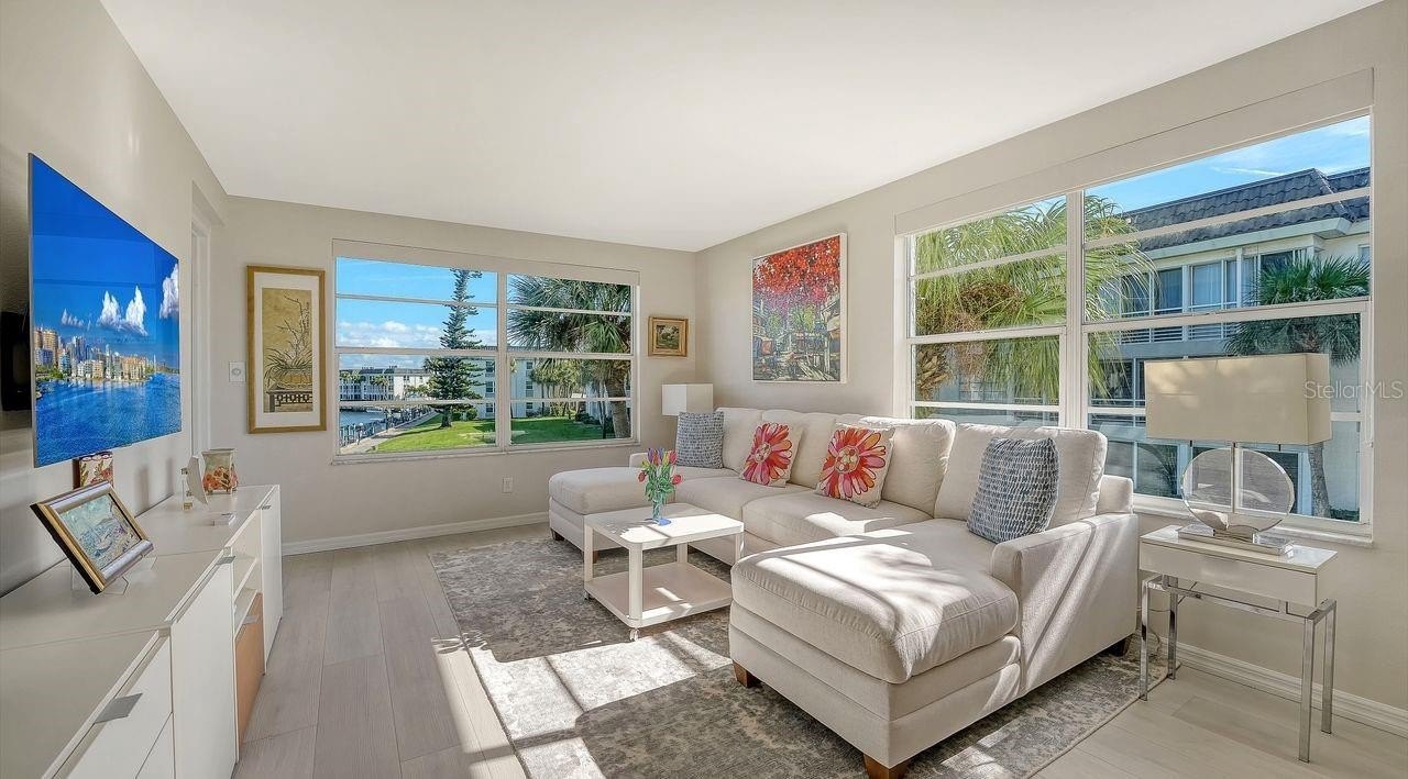 Welcome to an exquisite, newly remodeled second-floor corner residence in the highly sought-after Longboat Harbour community. Reimagined with sophisticated coastal design, this light-filled home captures sweeping views of Sarasota Bay and Longboat Harbour—creating a serene backdrop from morning to sunset.