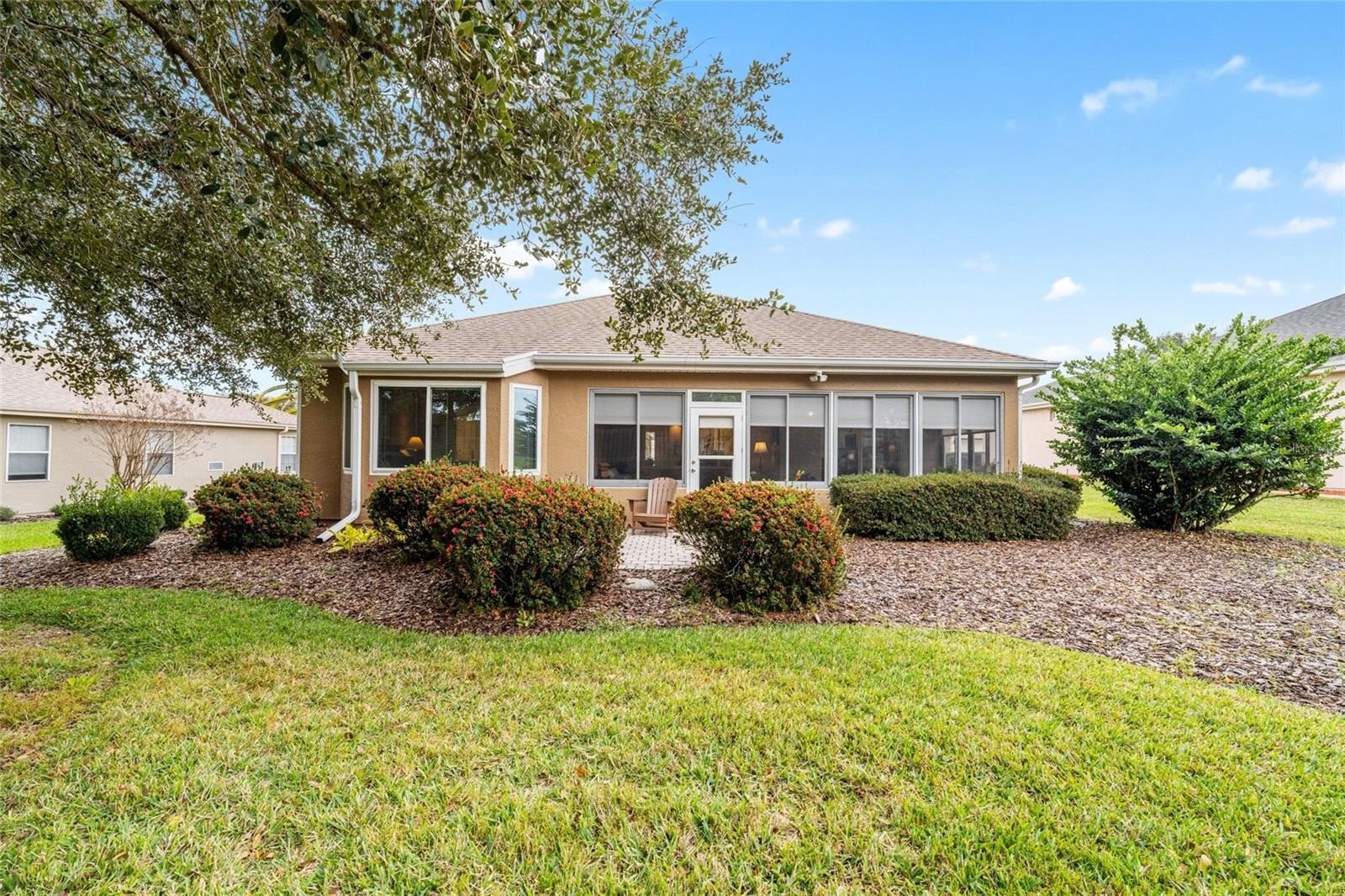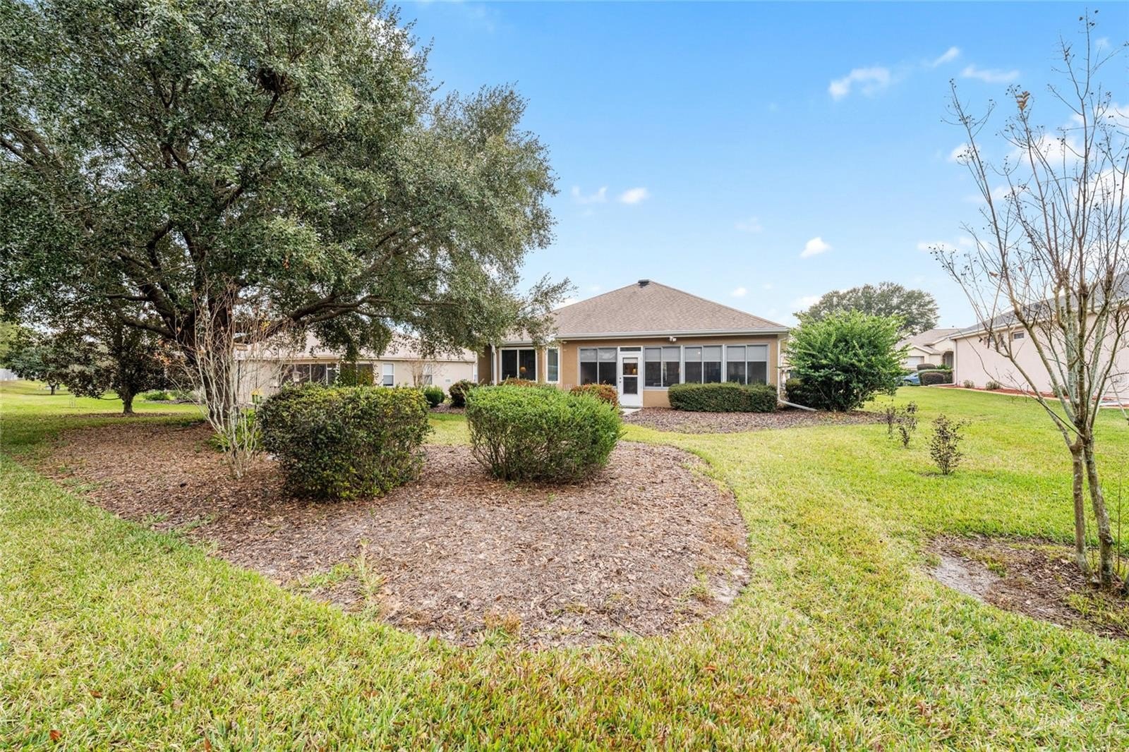The guest bedroom, located at the front of the home, offers carpeted flooring, wood valances, and a ceiling fan. The fully remodeled guest bath features tile flooring. A versatile study/den with engineered wood flooring is positioned between the bedrooms and provides ample space for an office, seating area, and even a hide-a-bed. The living and dining areas feature engineered wood flooring, mini blinds, and white wood valances. The enclosed lanai is under heat and air with acrylic windows and sunshades, overlooking a private fenced area just inside the boundary lines. An adjacent outdoor patio provides the perfect spot for grilling and enjoying the Florida sunshine.