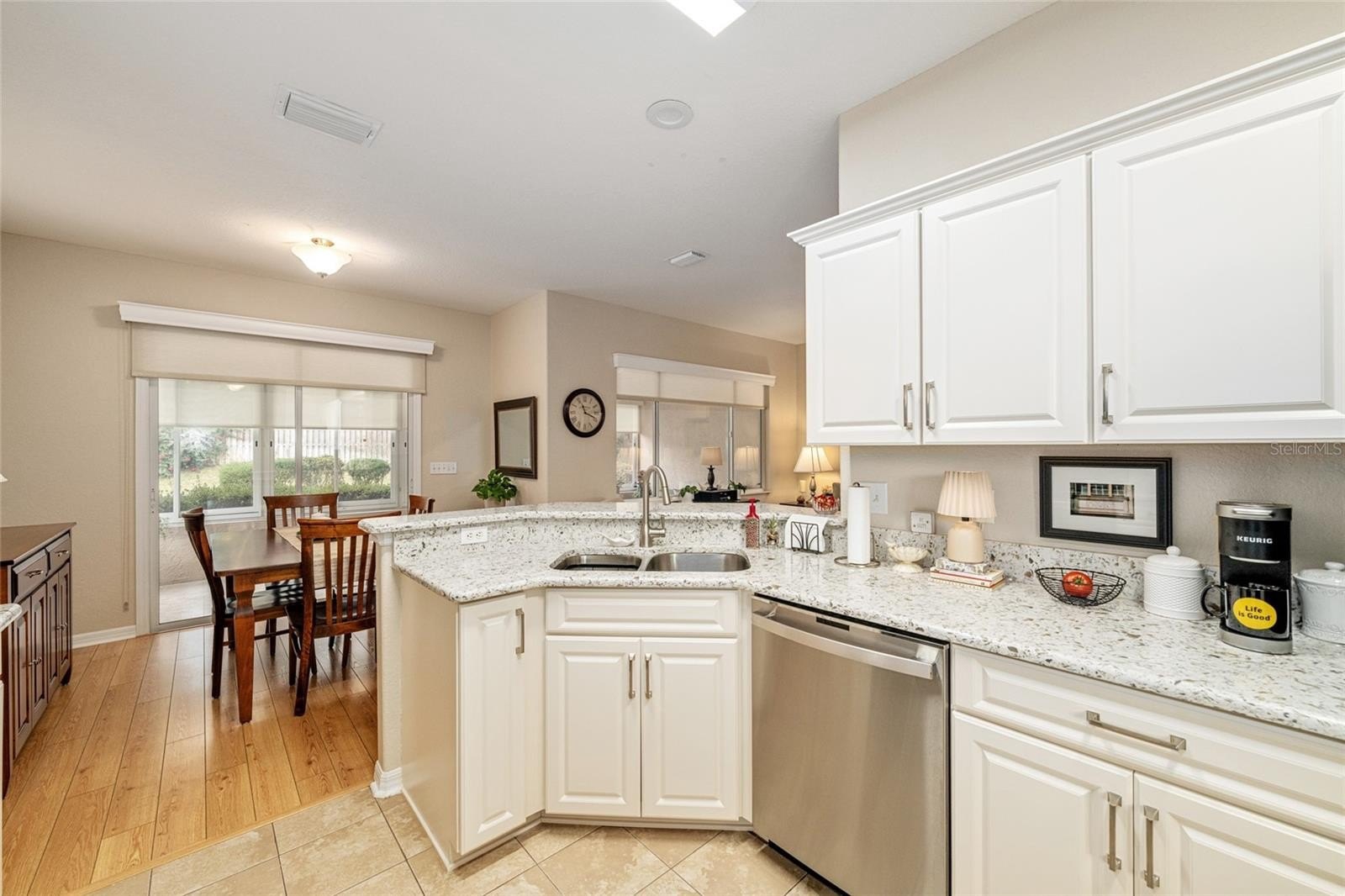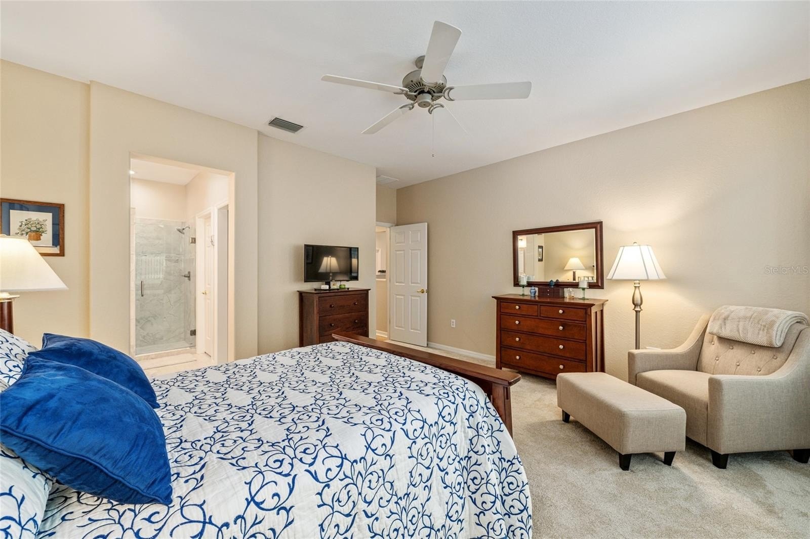 One of Del Webb’s most popular models is now available and truly a must-see. Situated on a very private lot with room for a pool, this beautifully upgraded home offers exceptional indoor and outdoor living. From the moment you review the description, photos, and video, you’ll want to schedule a personal tour. The upgraded kitchen features tall white refaced cabinets with custom hardware, granite countertops, stainless steel appliances, recessed lighting, and ceramic tile flooring. The spacious primary suite includes bay windows, a ceiling fan, carpeted flooring, and a completely renovated ensuite with a large walk-in shower, skylight, and tile flooring.