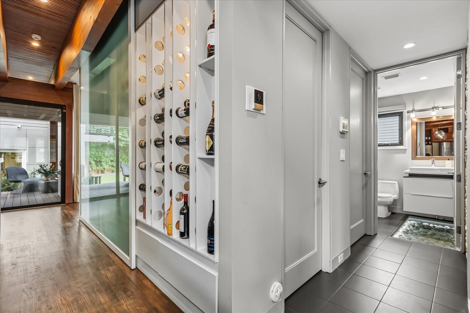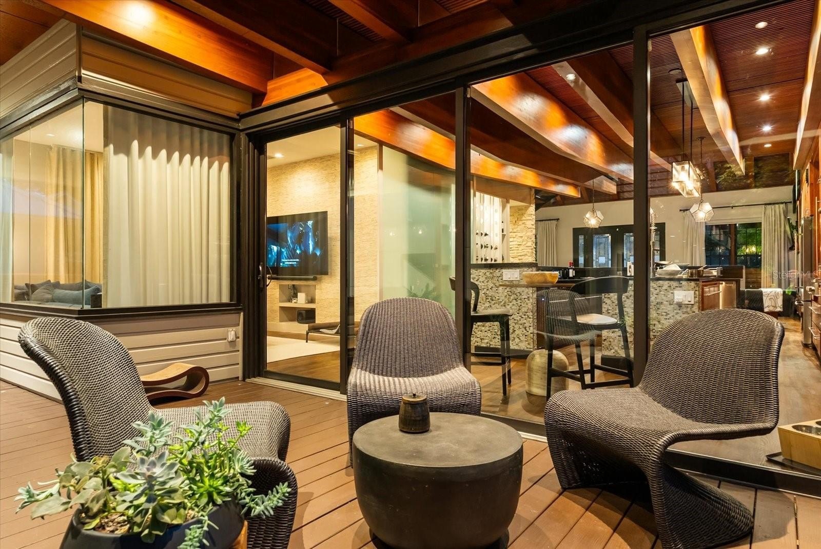 The main home’s 3,528-square-foot floor plan features a chef’s island kitchen, wine bottle wall, a great room with fireplace, and a versatile and hidden den/office/media space with a glass/ metal privacy door. Entertain in the elegant dining area highlighted by the floating staircase. Upstairs, the serene primary suite offers a spa-like bath, custom walk-in closet and a balcony complemented by two additional generously sized bedroom suites.