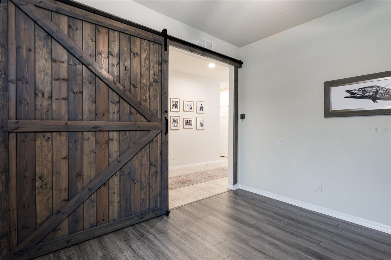 The interior layout includes a recently refreshed split floor plan (painted 2023), two spacious guest bedrooms with shared bath, a versatile den/office (suitable as a potential fourth bedroom), and a primary suite with an upgraded master bathroom (2024). The main living area is designed for flexibility and comfort, featuring an open-concept kitchen, dining, and living space. The kitchen is equipped with a large island, granite countertops, decorative backsplash, stainless steel appliances, and enhanced cabinetry. The living area offers an electric fireplace set against custom shiplap and provides access via a large slider to the covered lanai, open patio, and a fenced yard with water views.
