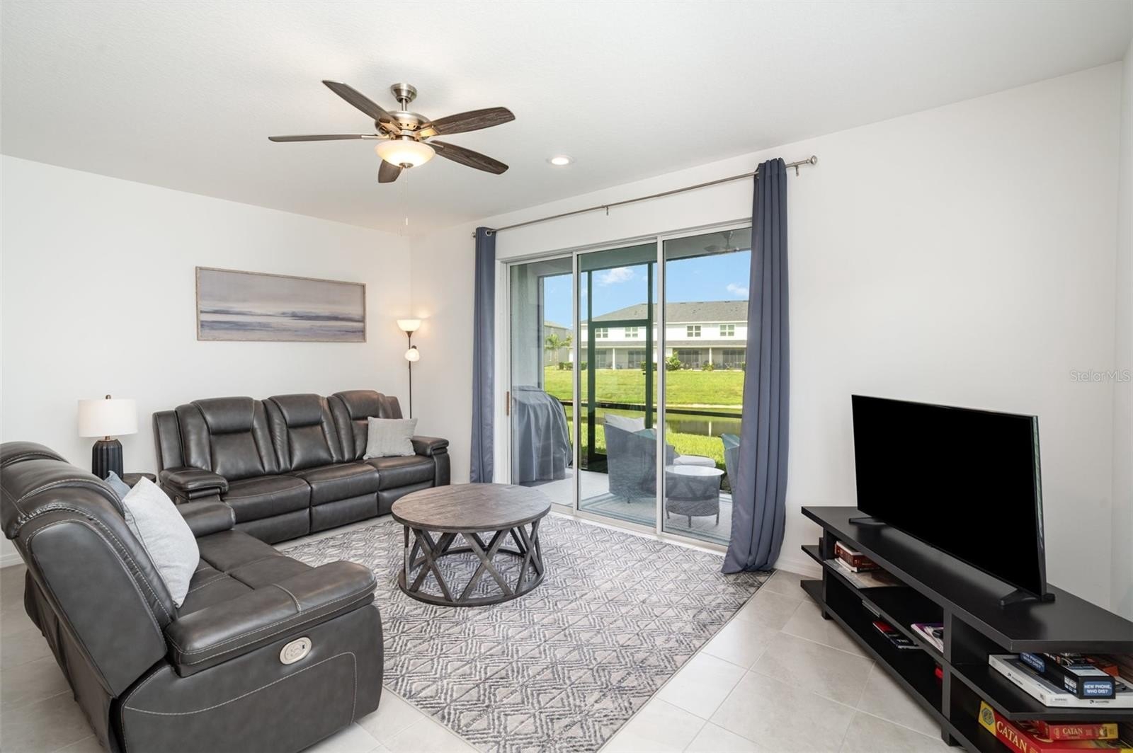 Inside, the open-concept floor plan is enhanced by an extra side window, filling the living area with natural light. The modern kitchen is a true highlight, featuring gray cabinetry, sleek granite countertops, stainless steel appliances, and a spacious island—perfect for cooking, entertaining, or casual dining. The living room flows seamlessly to the screened lanai, where you can relax and enjoy peaceful water views—a private retreat right at home.