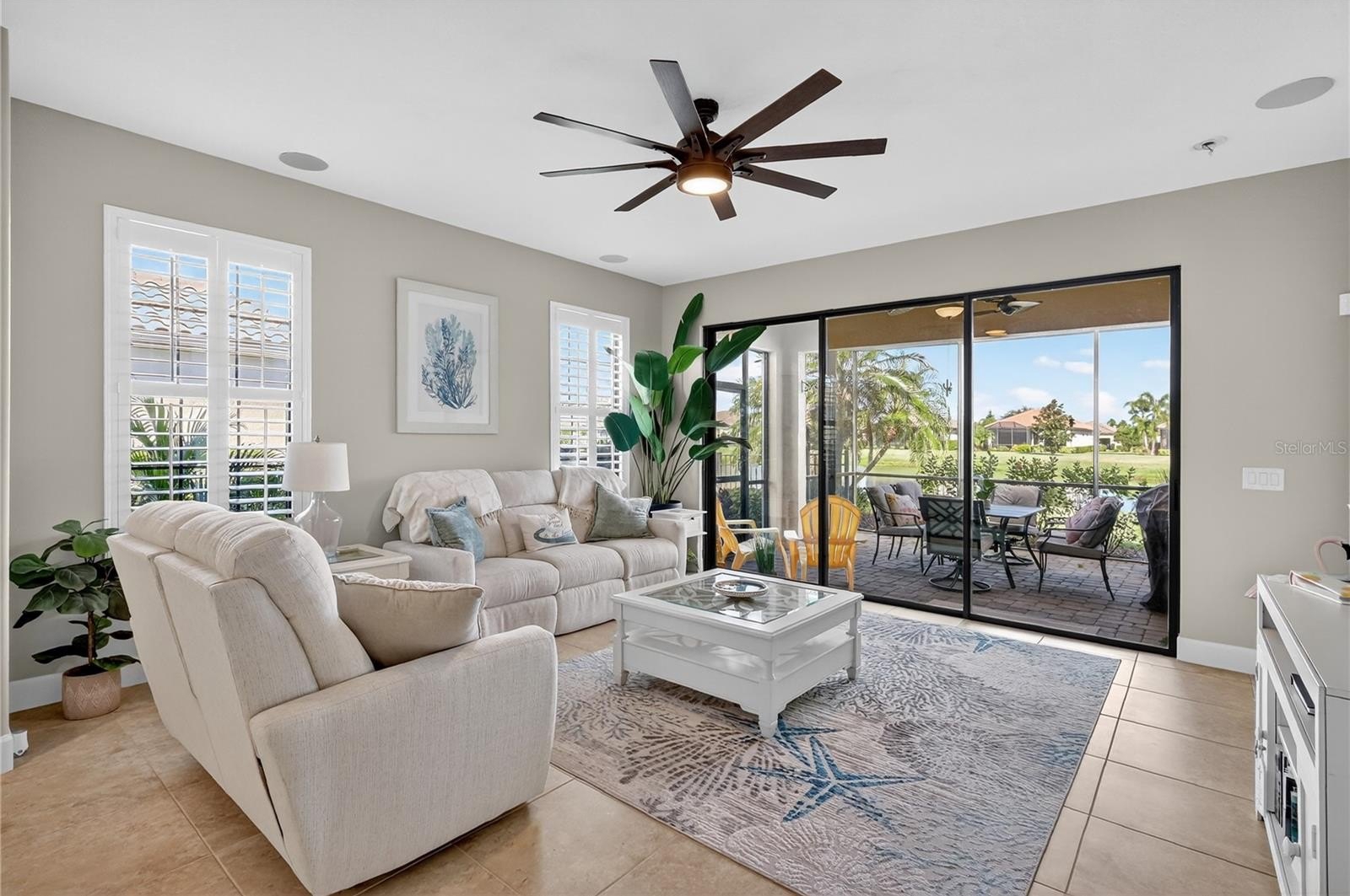 Enjoy serene indoor-outdoor living with a screened-in lanai overlooking a peaceful water view, perfect for morning coffee or evening relaxation.