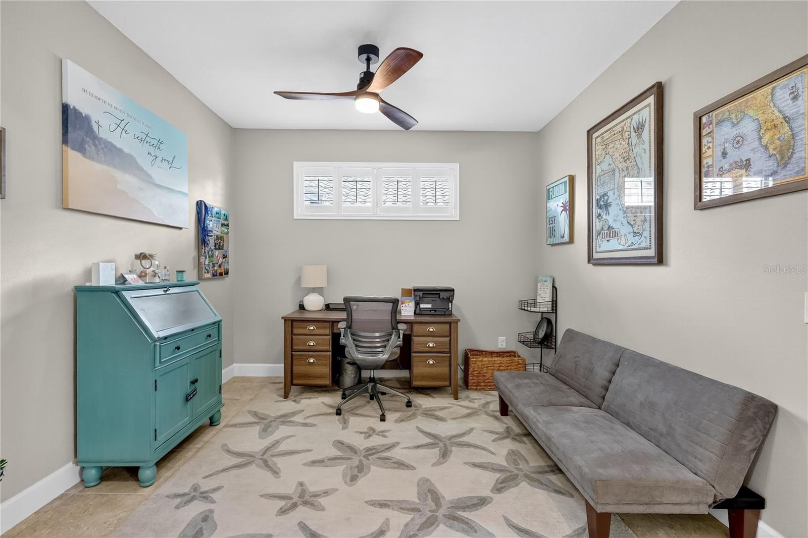 The private primary suite includes a spa-like bathroom with dual sinks, a walk-in shower, and a generous walk-in closet. A second bedroom and full bathroom provide comfort for guests or flexible space for a home office.