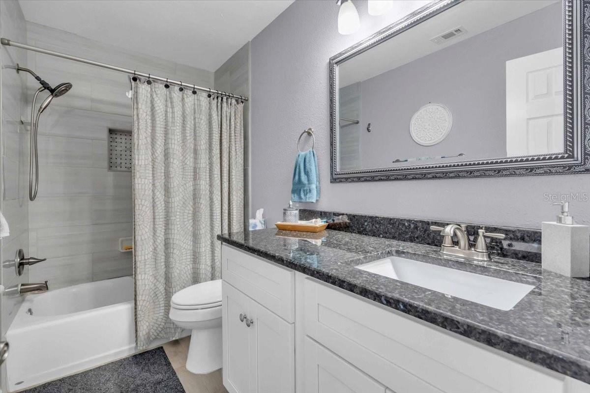 The heart of the home features a stunning kitchen that underwent a complete 2021 remodel, now equipped with stainless steel appliances, a generous 33-inch-deep sink, wood shaker cabinets, and custom granite countertops that extend to create an inviting eat-in bar. The fully covered granite backsplash ensures easy maintenance, while wood-look glazed porcelain tile flooring adds both beauty and durability underfoot. LED recessed lighting with dimmer switches adds both functionality and ambiance to your culinary adventures.