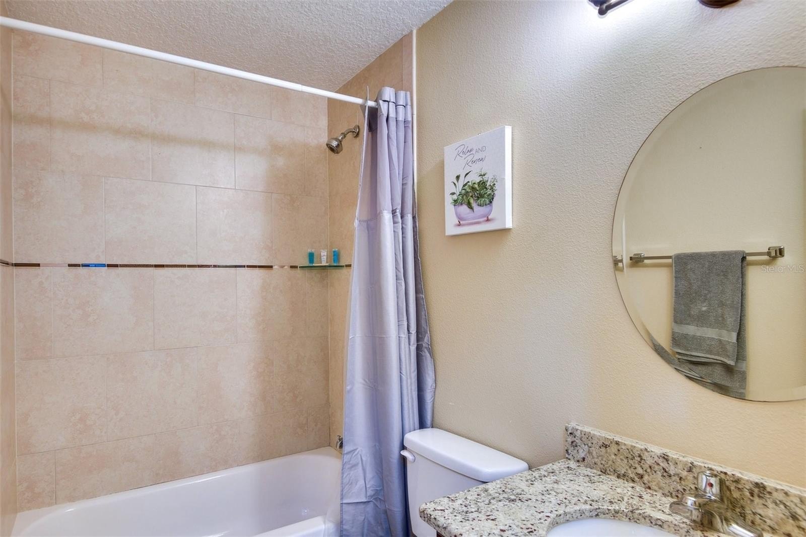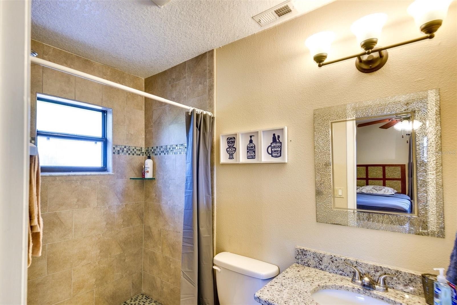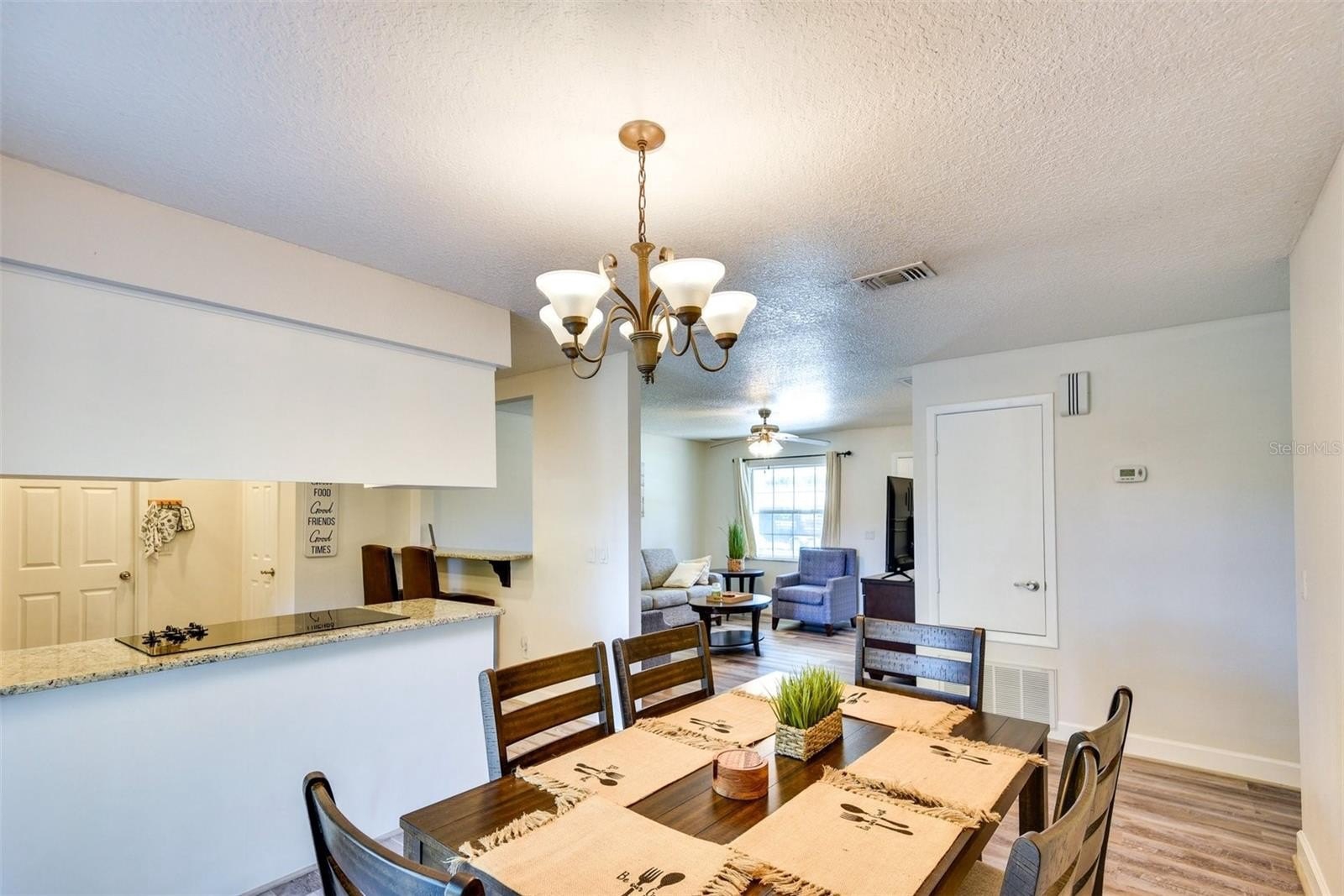 Inside, the open floor plan features ceramic tile and luxury vinyl flooring throughout. The kitchen has been upgraded with granite countertops, a custom tile backsplash, and stainless steel appliances, creating an inviting space that connects seamlessly to the dining and living areas. The primary suite includes a private bath with a modern walk-in shower, while the guest bathroom offers a classic tub and shower combination. A dedicated inside laundry room with washer and dryer adds everyday convenience.