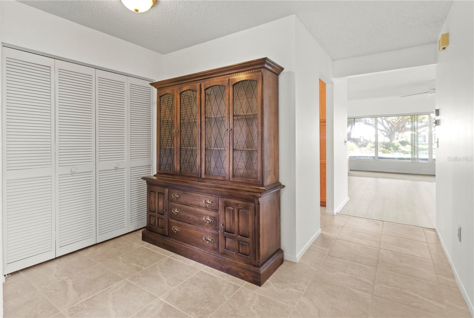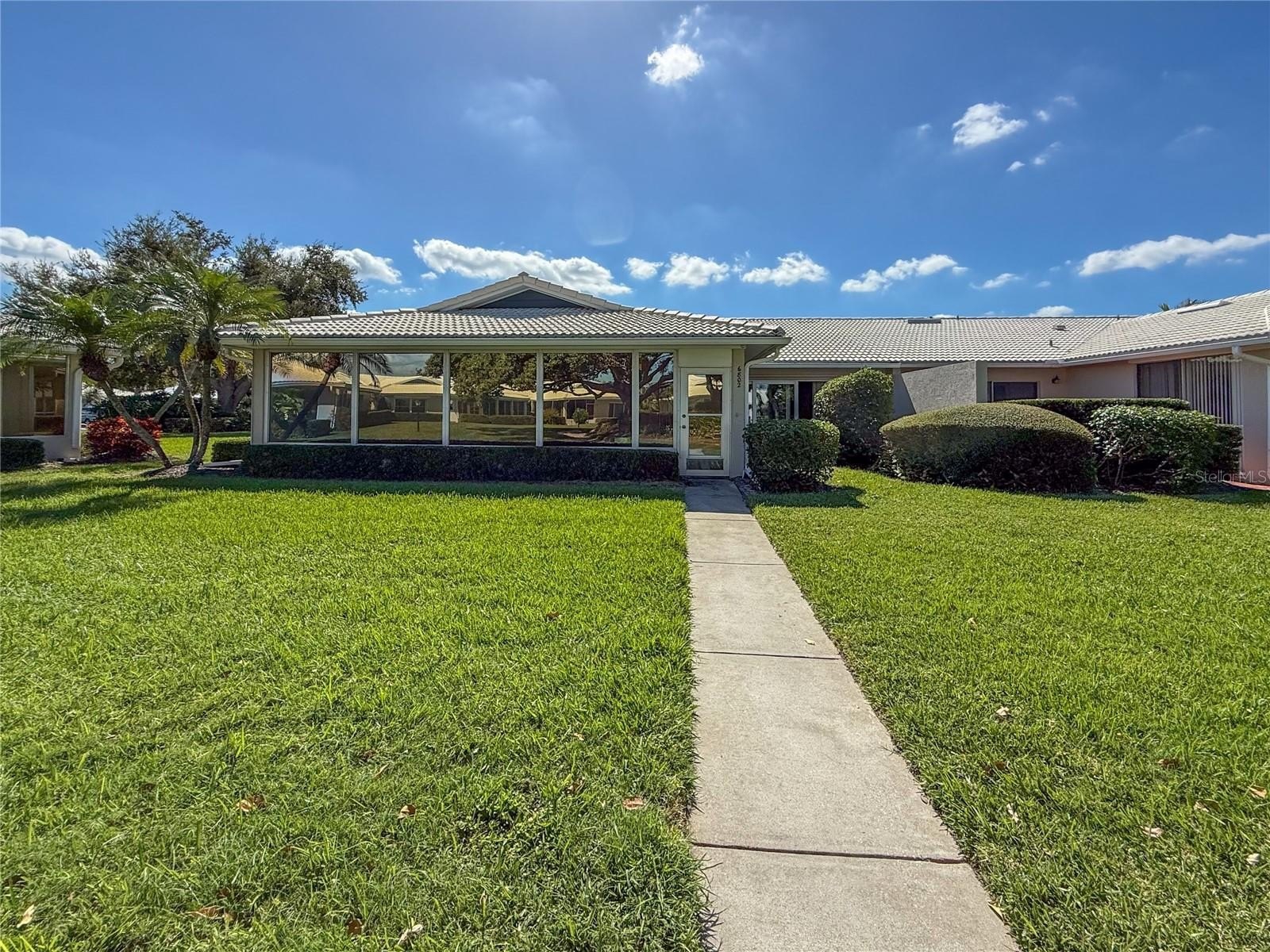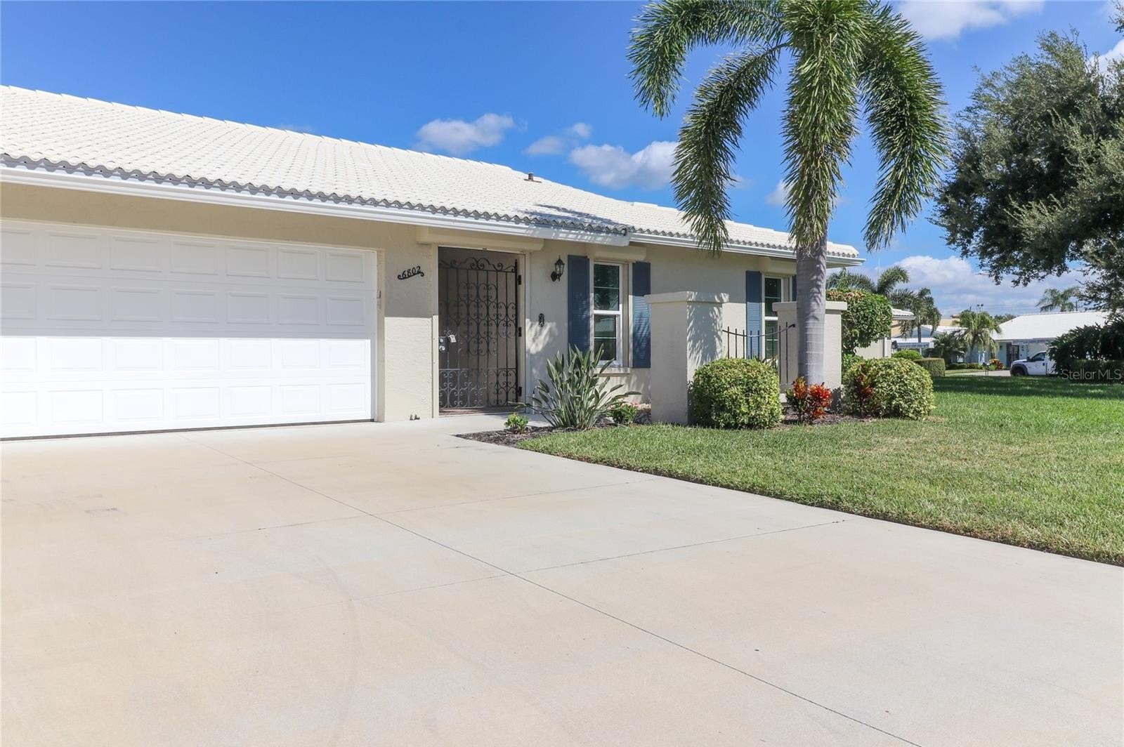 Step inside and discover 1,913 square feet of air-conditioned living space with an inviting glass-enclosed Florida room overlooking a tranquil greenbelt. The open, spacious floor plan features two oversized bedrooms with generous storage, a bright living and dining area, an eat-in kitchen, and a two-car garage. A charming wrought iron gate secures the front entry, adding both privacy and appeal.