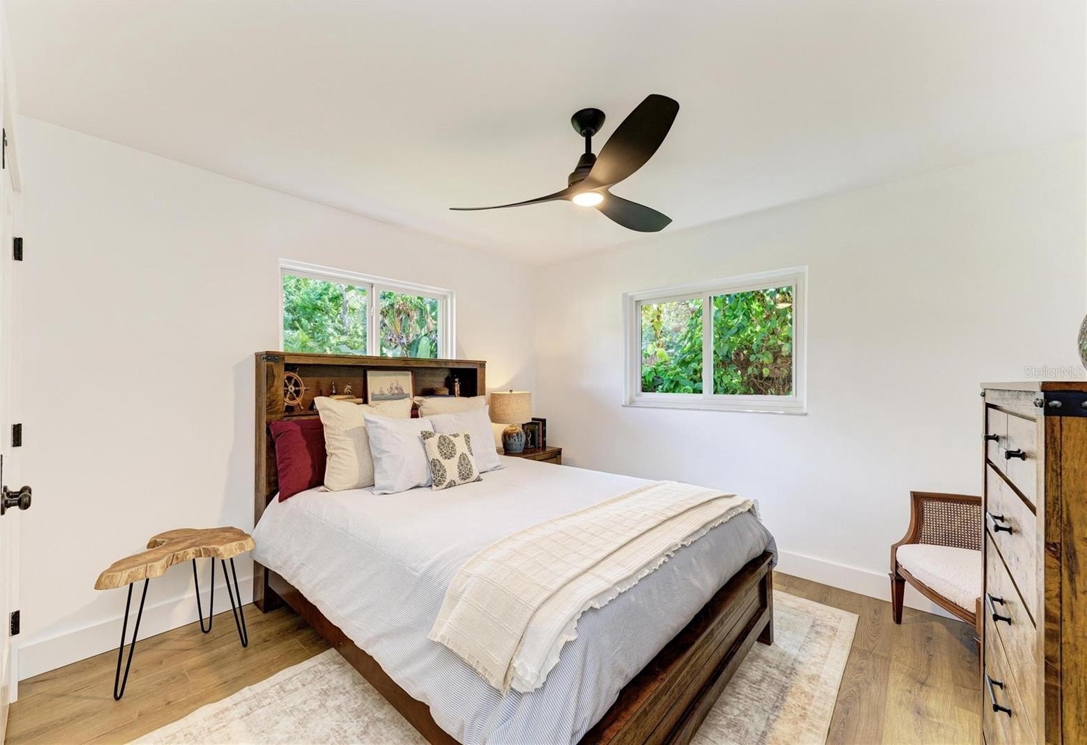 Retreat to the spacious master suite, which features a large walk-in closet with built-in wood shelving for all your storage needs. The newly fenced backyard is perfect for gatherings and has ample space for adding an outdoor patio, an addition, a pool, propane fire-pit, with the potential for a second story that could provide breathtaking views of Sarasota Bay. Fresh landscaping and sod, complemented by a recently installed irrigation system in both the front and back yards, enhance the outdoor space. The front yard also showcases vibrant new sod and landscaping, elevating the home's curb appeal. All-new soffits and fascia in a stylish bronze finish complete the exterior look, while a propane and plumbing line has been run for potential outdoor kitchen setups, including a built-in propane grill and/or burners and a sink.