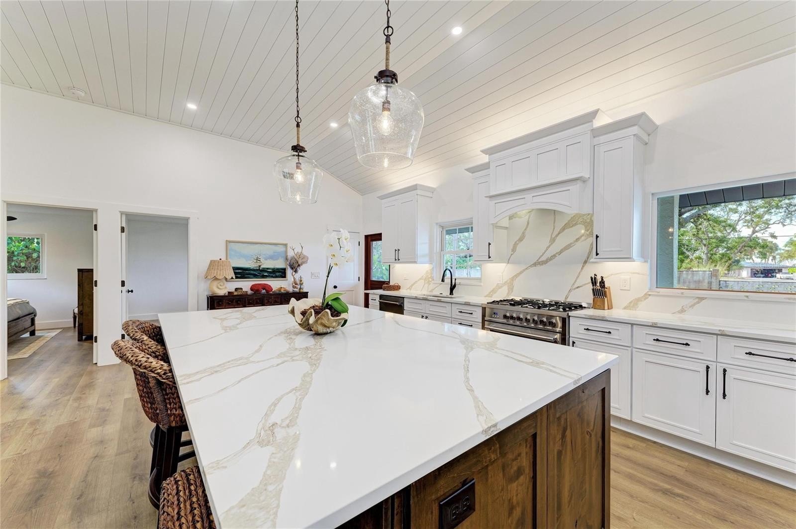 The heart of the home is a stunning, completely renovated gourmet kitchen perfect for entertaining. Equipped with solid wood soft-close cabinets, a vast quartz island, and high-quality new appliances. The kitchen also features under and over cabinet lighting, a stylish tile backsplash bar with glass shelves and puck lighting, as well as newly added propane lines and a tank for the gas stove, for all your culinary adventures.