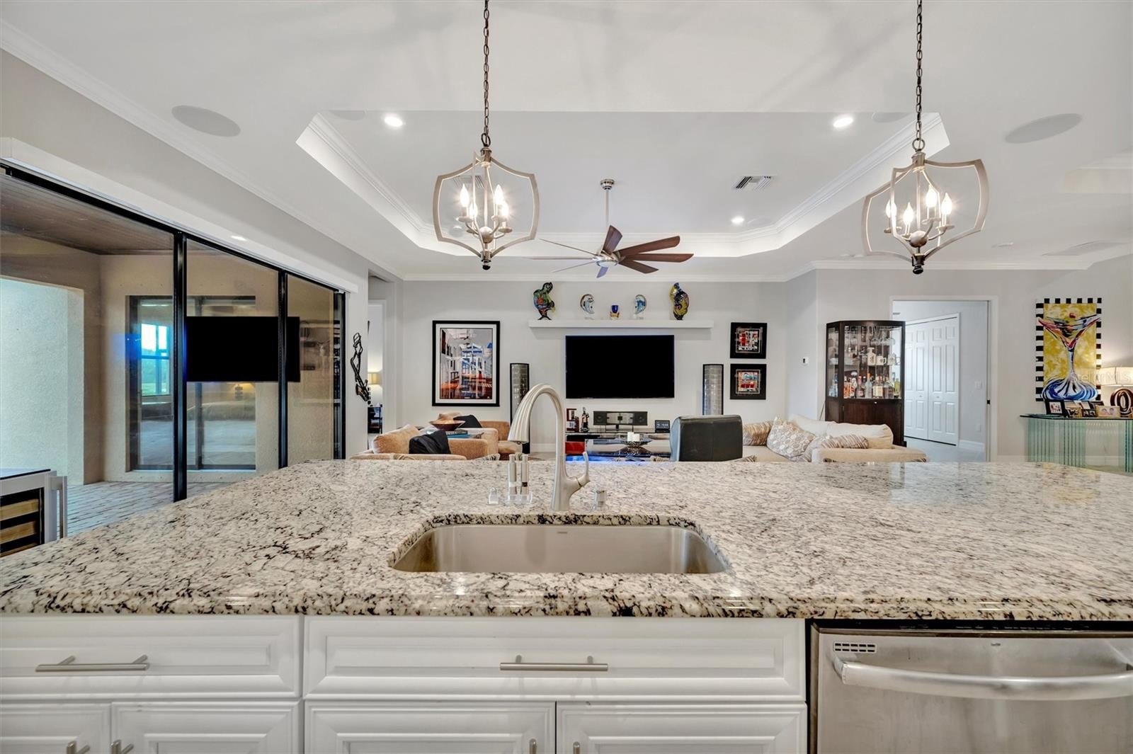 This beautifully appointed Angelina model features 3 bedrooms, 2 bathrooms, and a private pool and spa, designed with an open floor plan ideal for both everyday living and entertaining. Thoughtful upgrades include tray ceilings, electric shades on doors and windows, and a gourmet kitchen showcasing updated light cabinetry and GE appliances. The dining area has been enhanced by removing decorative poles and arches, creating a more open and inviting space. The primary suite offers a luxurious retreat with an elegant soaking tub, double vanities, and two spacious closets. Step outside to your private outdoor oasis, complete with a screened pool and spa, panoramic water views, and a fully equipped outdoor kitchen featuring a gas grill and beverage refrigerator—perfect for relaxing or hosting guests.