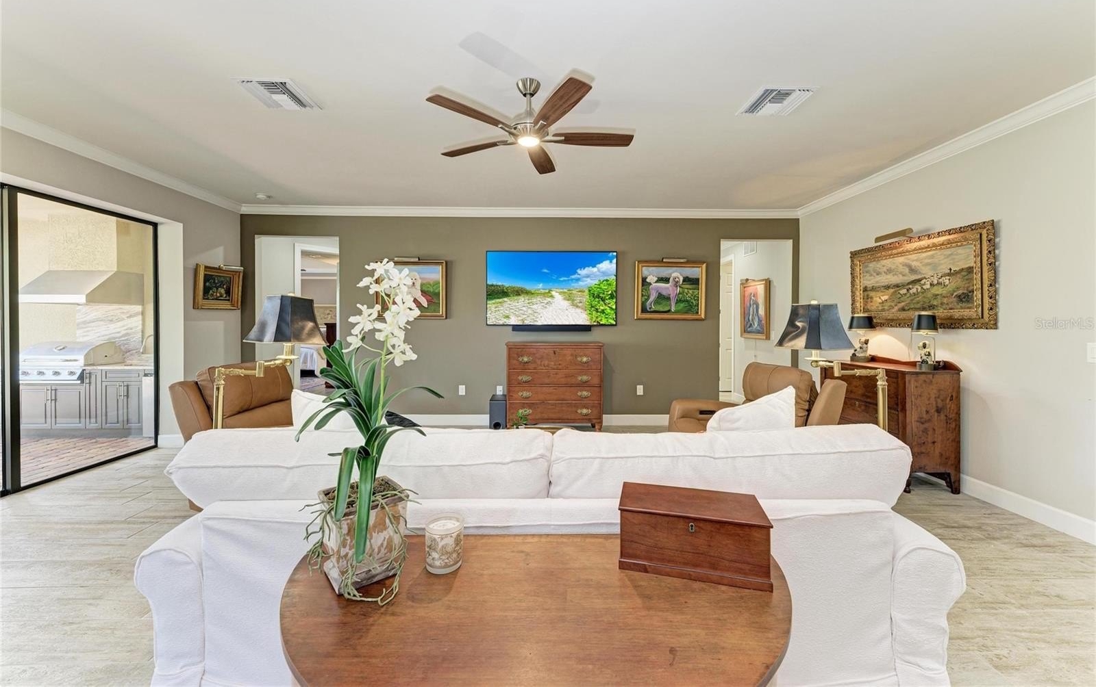 Welcome home to this beautifully appointed Pinnacle model located in the premier 55+ community of Del Webb at Lakewood Ranch. This spacious 3 Bedroom, 3 Bath residence with a private office and 3 Car Garage is thoughtfully designed with both style and functionality in mind. NEW 2024 GENERAC WHOLE HOUSE GENERATOR ALONG WITH HURRICANE RATED LANAI SCREENS! The open-concept layout features porcelain plank tile flooring, while the bedrooms are finished with LVP flooring for comfort and durability. The chef in the family is sure to enjoy the well-appointed kitchen complete with gas appliances, 11' breakfast prep bar, and an abundance of cabinetry. The spacious primary suite offers a true retreat with walk-in shower, double sink vanity, and an oversized walk-in closet. Additional bedrooms include a private guest suite with its own bath, providing comfort and privacy for visitors. Step outside to the expansive 43’x 35’ screened-in paver lanai with a fully equipped outdoor kitchen, perfect for entertaining or relaxing. The 3-car garage is enhanced with built-in cabinetry, providing exceptional storage and organization. Plantation shutters, a leaded glass front door, and a tile roof are just a few of the many upgrades. The home is situated on an oversized lot, offering added privacy and room to unwind. Residents of Del Webb enjoy resort-style amenities including clubhouse, fitness center, pools, pickleball and tennis courts, restaurant, billiard room and art studio. A full-time lifestyle director is on staff to insure an active social calendar. Dell Webb is a gated, maintenance-free community conveniently located within minutes to shopping, dining, and top-rated medical facilities. Just a 30-minute drive to pristine Gulf Beaches. This home truly defines exceptional Florida living, start living the good life now!