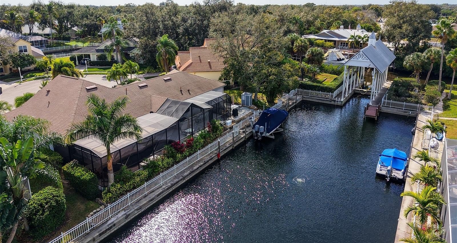 This is a three-bedroom, plus den/office, three-bathroom canal front home with a 10,000 pound boat life installed in 2024. This unfurnished home has 2,073 square feet of air-conditioned living space and 2,847 square feet under roof. The improvements that the current owners have made are a new 10,000 pound boat lift in 2024 with new pilons, electric and water at the dock, which is on the seawall and walking distance to the lock system. Inside, new tile flooring and lighting throughout. The Kitchen has been updated and has a new refrigerator and microwave. A new washer/dryer in the inside utility closet off the Kitchen. The garage has new epoxy flooring and the pool has a new light, skimmer, and refurbished pool cage. The rear lanai has a new outdoor Kitchen with built-in countertops, steps and patios. This home is in the cul-de-sac with a circular driveway and a two-car garage. There is a double door entry into the foyer with the den/office/study to the left and the living room to the right. It has a separate dining room with a granite butler countertop with storage underneath. The third bathroom, shower only (pool bath) is off the hallway and between both guest bedrooms (the 2nd and 3rd) is a shower only 2nd bathroom. The primary suite has dual walk-in closets and a newly updated bathroom, with dual glass sinks, separate tub and separate shower stall. The living area, Kitchen, and the primary suite look over the huge screened lanai area and the canal. Sliding glass doors out and French doors from the primary suite. This is Florida and outdoor living is a must. The caged pool lanai (patio) area has four sections. A 9 x 13 covered area for relaxing seating. The concrete pool deck area is 15 x 36 and the 10 x 24 swimming poo and 9 foot diameter spa. The 15 x 32 summer kitchen area, with built-in countertops with stools, the television, table and chairs. Outside the cage is a 13 x 15 open patio with tables, chairs and an umbrella very close to the boat lift. This entire area is for the maximum outdoor living space and for owners, like there who enjoy entertaining and enjoying life. The Master Association is responsible for the maintenance and operation of all of the Common Areas and boating amenities in The Inlets. This includes an extensive fresh-water and salt-water canal system with over 27,000 linear feet of canal walls. Eleven crane hoist lifts transport members’ boats from fresh-water storm water management canals into the Manatee River. Other amenities include a tennis/pickleball court, playgrounds, nature walks, kayak runs, and green spaces. The Association maintain community standards, manages shared amenities, promotes boating safety, and fosters a sense of community among residents for $603 bi-annually. Every member/resident belongs to two Associations. Every member belongs to The Master Association which is responsible for boating and canals and common areas. Depending on the address, every member also belongs to a sub-association which is responsible for rules concerning individual residences, mailboxes, streets, etc. for $90 a quarter. If you are a boater or just love living and entertaining at your own home, this property is a must see. It is easy to see, to show and to sell.