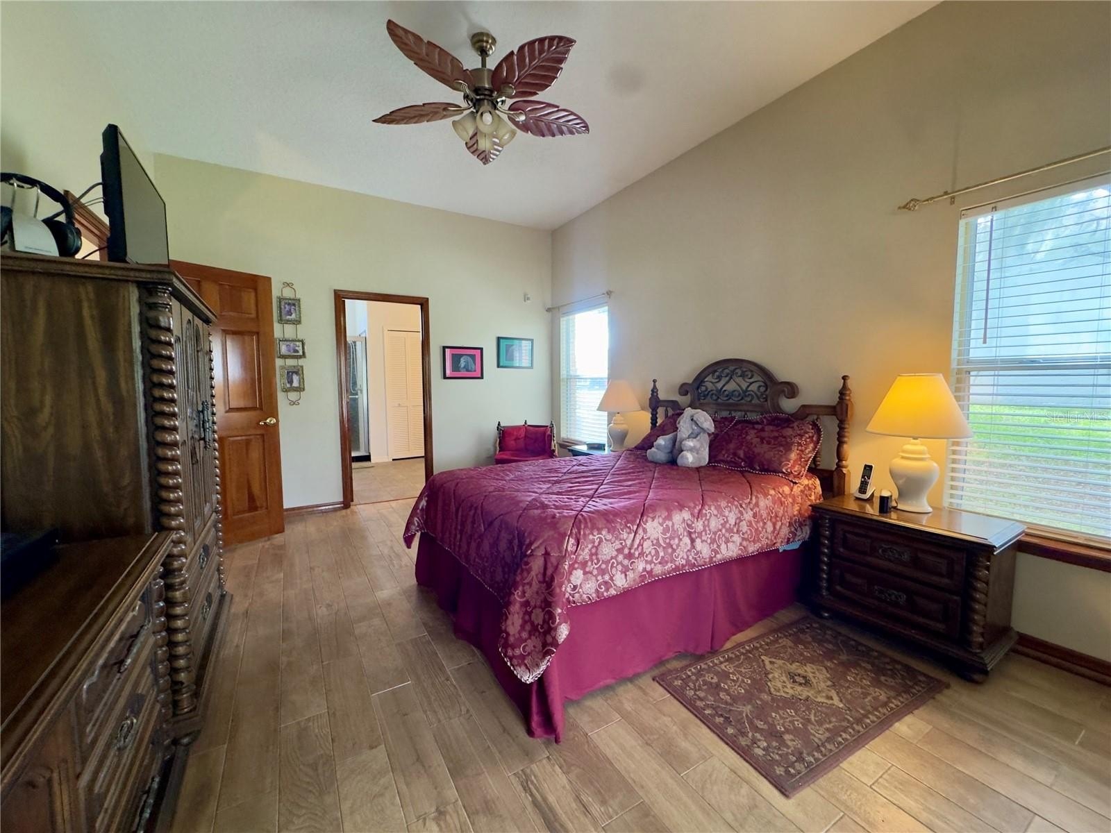 The luxurious primary suite features a completely remodeled bath, complete with a walk-in shower, water closet, double vanity, and his-and-hers walk-in closets. Both additional bedrooms also offer walk-in closets—plenty of storage for everyone!