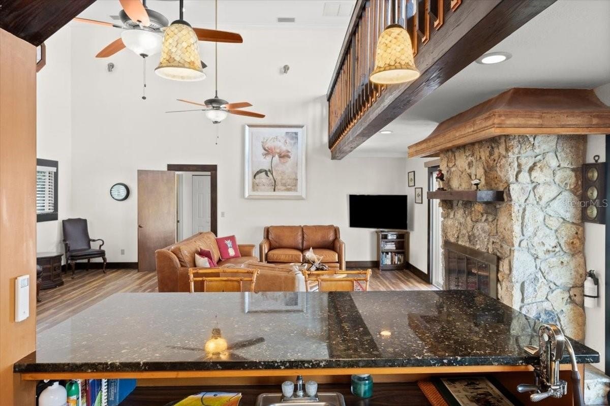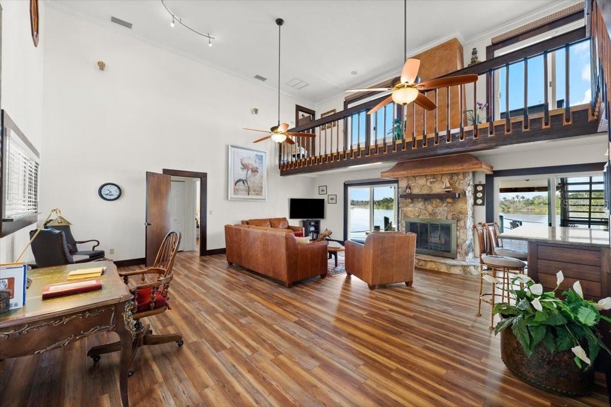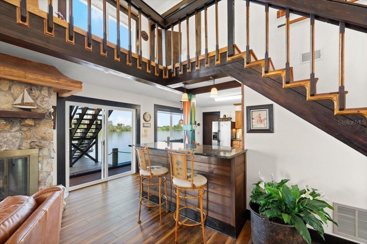 This spacious 4-bedroom, 3-bathroom home spans nearly 2,900 square feet, with large, light-filled living spaces designed to celebrate the water view from nearly every angle. The soaring ceilings, rich wood finishes, and a stone fireplace create a warm and welcoming interior, while newer windows and doors frame the ever-changing colors of the river at dusk.