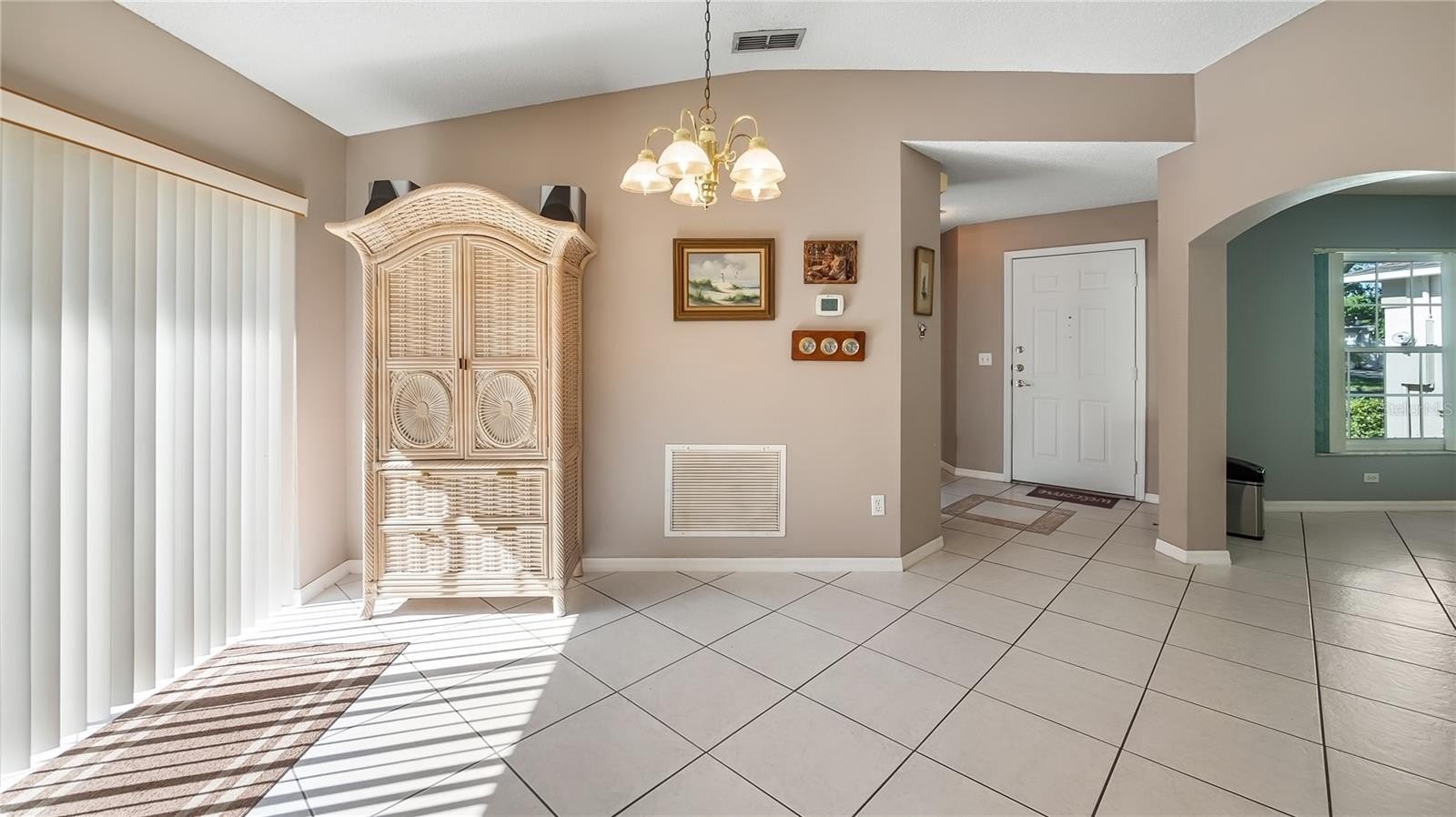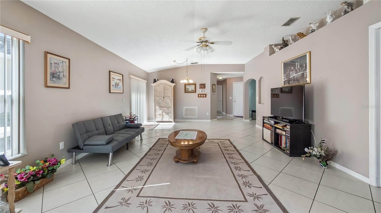 WELCOME HOME to Kings Ridge – 55+ Living at Its Finest! Nestled in the highly sought-after Whitehall neighborhood of Kings Ridge, this delightful 2-bedroom, 2-bath Bristol model offers bright, spacious living in a vibrant 55+ gated golf community. Residents of Whitehall enjoy their own private pool and tennis courts, in addition to all the top-tier amenities Kings Ridge has to offer. Step through the screened front porch into a welcoming foyer that opens to a large living and dining area combo—ideal for entertaining or simply relaxing. The kitchen, freshly painted and refreshed, sits just off the entry with a charming breakfast nook—perfect for morning coffee with views of the front garden. All appliances are included, with the exception of the microwave, and the interior has been freshly painted, offering a clean, move-in-ready space. The split floor plan provides privacy, with a spacious primary suite featuring a walk-in closet and a large bathroom. The guest bedroom and bath are conveniently located on the opposite side. Natural light fills the home, creating a cheerful and airy ambiance throughout. Enjoy the enclosed patio year-round, with windows that open during the cooler months and views of the private backyard—ideal for gardening or your own tranquil retreat. The garage boasts sleek acrylic flooring and includes a washer and dryer. Recent updates include a freshly painted exterior (June 2025), a new A/C (2021), a hot water heater (2021), and the roof is approximately 12 years old. Living in Kings Ridge means enjoying a resort-style lifestyle with multiple heated pools and spas, two fitness centers, tennis and pickleball courts, shuffleboard, billiards, a library, and an exciting social calendar filled with shows, clubs, bingo, and more. Plus, you're just a golf cart ride away from Kings Ridge Plaza for shopping, dining, banking, and everyday conveniences. Experience the Royal Lifestyle—schedule your private tour today!