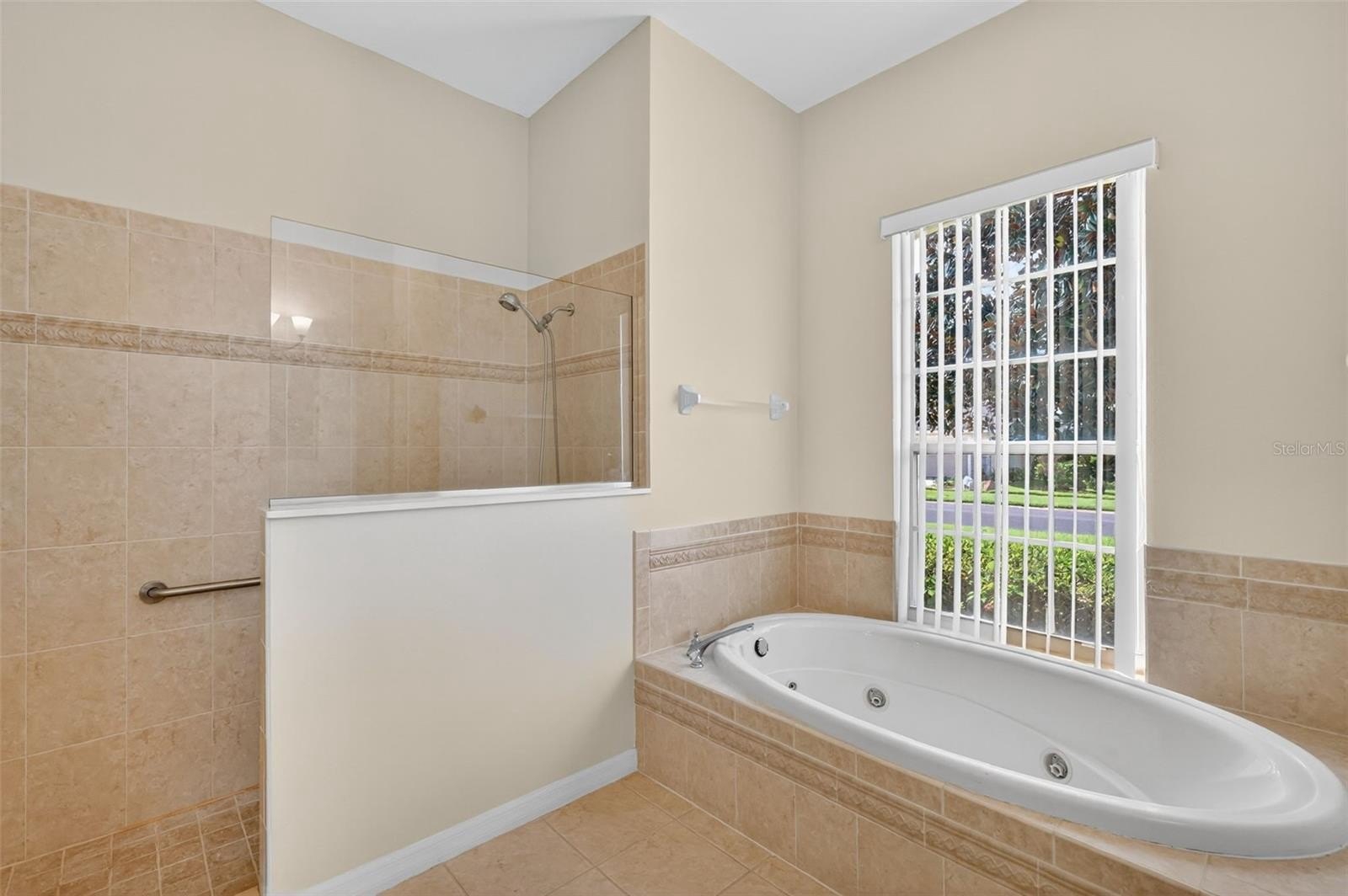 This desirable split-bedroom design includes a luxurious primary suite with private lanai access, two oversized walk-in closets, and a spa-inspired bathroom complete with a jetted tub, custom-tiled Roman walk-in shower, and listello accents. The dual-sink oak vanity completes the elegant space. Two expanded guest bedrooms share a well-appointed adjacent spa bath.