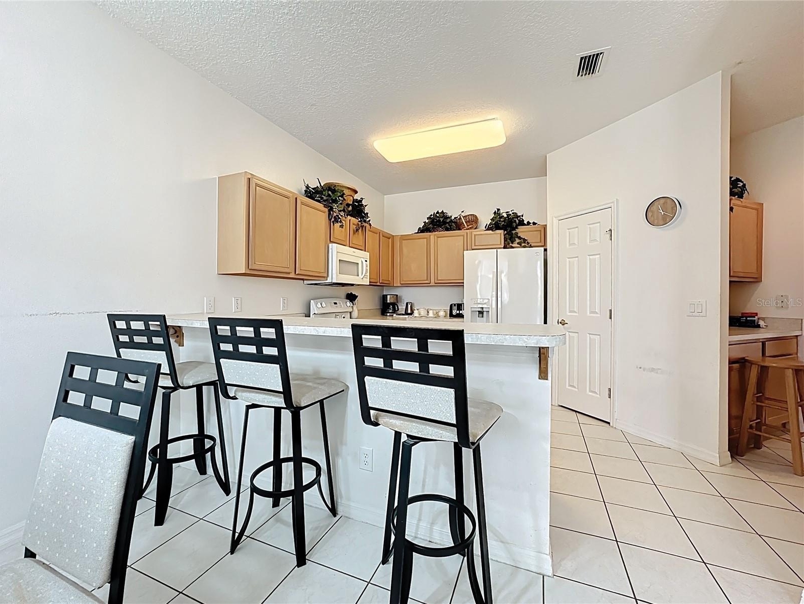 Step inside to high ceilings and an open, sunlit layout. The living room flows to the outdoor area, where sliding doors open to a heated pool and spa with outdoor shower, surrounded by mature landscaping for a private, resort-style setting. The fully equipped kitchen offers ample cabinetry and a breakfast bar, ideal for casual dining. A bonus room provides a quiet space for a home office or study, while the garage-turned-game-room adds extra fun for everyone.