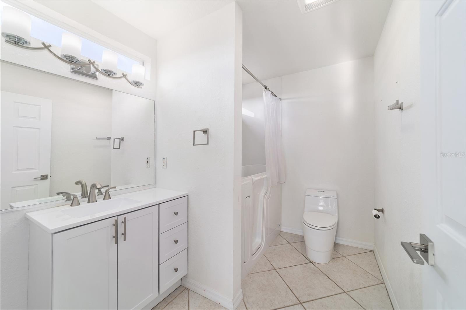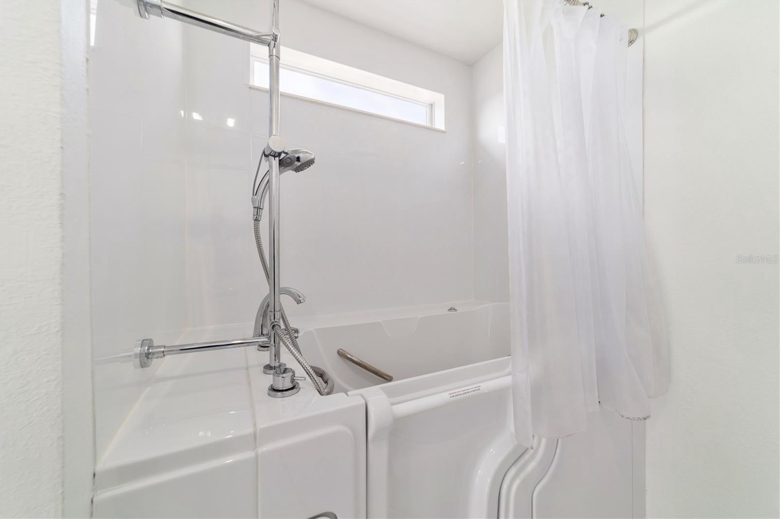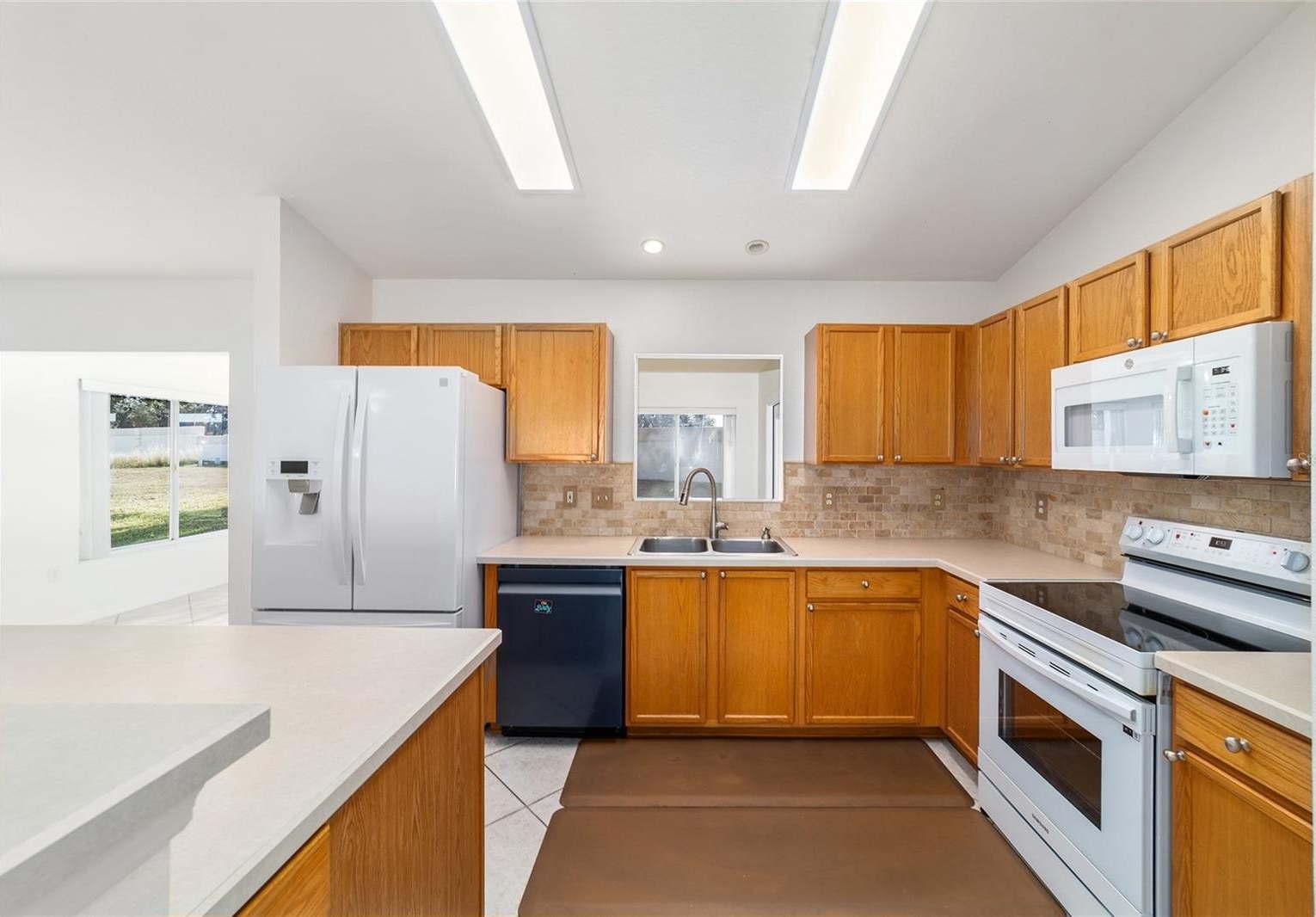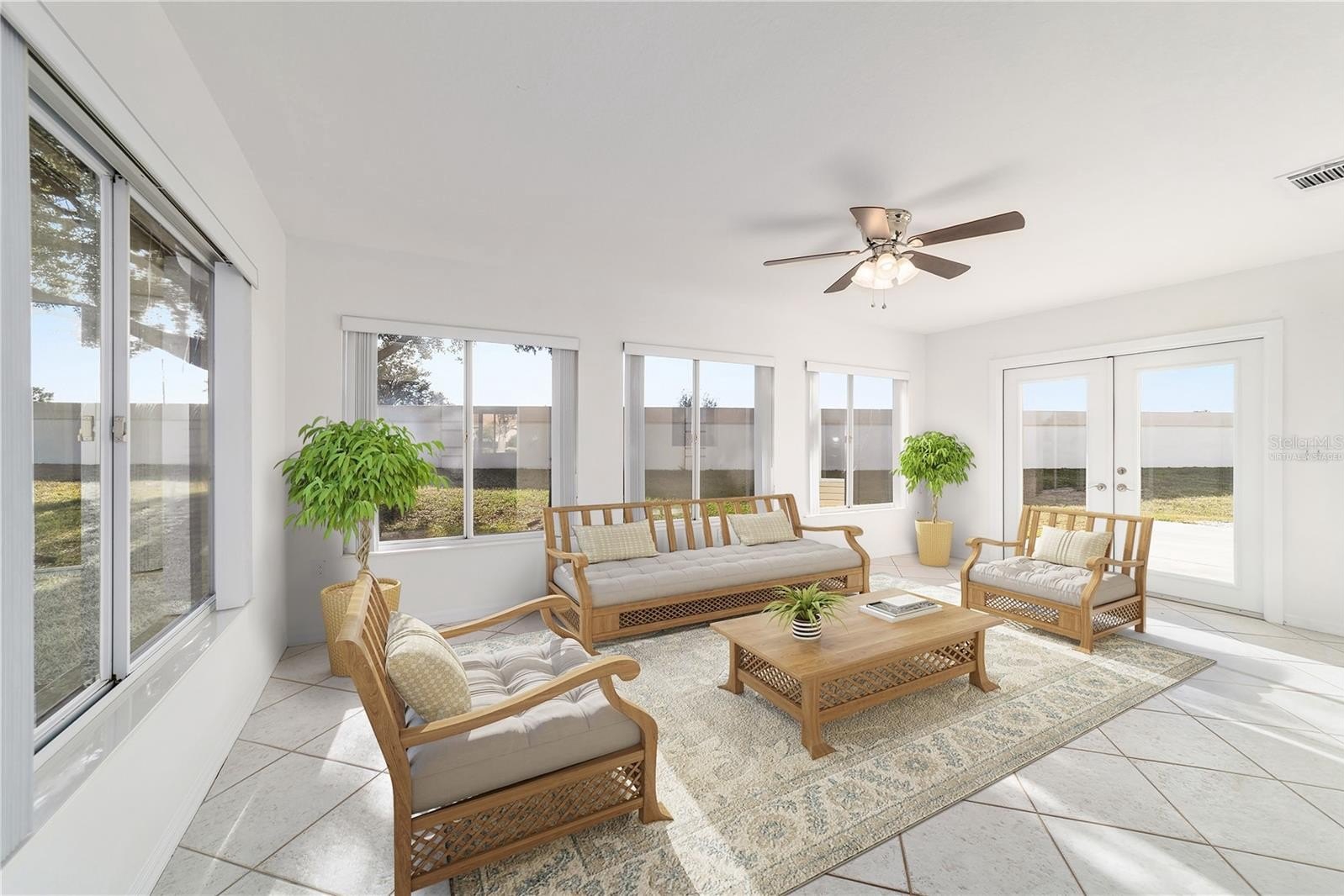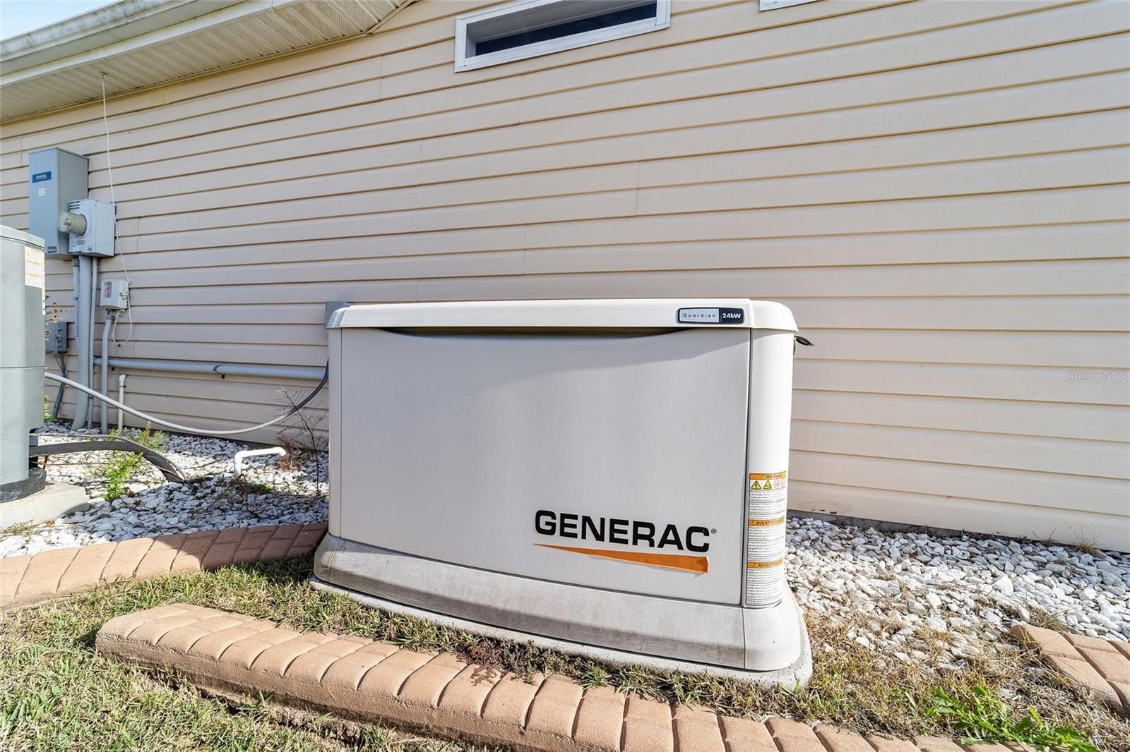 One or more photo(s) has been virtually staged. Discover exceptional value in this popular Chesapeake 2-bed/2-bath model featuring a bright, open floor plan and an expansive family room. Situated on a quiet cul-de-sac, this well-maintained home offers privacy, low-maintenance landscaping with attractive rock beds, and the added peace of mind of a whole-house Generac generator. Inside, vaulted ceilings and a split-bedroom layout create an inviting sense of space. The kitchen features an island with a breakfast counter, newer appliances, and flows seamlessly into both the formal dining and living rooms—ideal for everyday living and entertaining. No carpet anywhere—tile and laminate flooring run throughout the home for easy care and a clean, modern feel. The heated and cooled Florida room extends your living space year-round and leads to a generous 12' x 20' outdoor patio perfect for grilling, sunning, or simply relaxing. The ensuite primary bath includes a walk-in tub with jets and a shower. Laundry is conveniently located inside and equipped with a newer washer and dryer.This home is priced to sell—don’t miss your chance to see it today. Best of all, Solar Panels for reduced energy costs. All photos showing furniture are virtual.