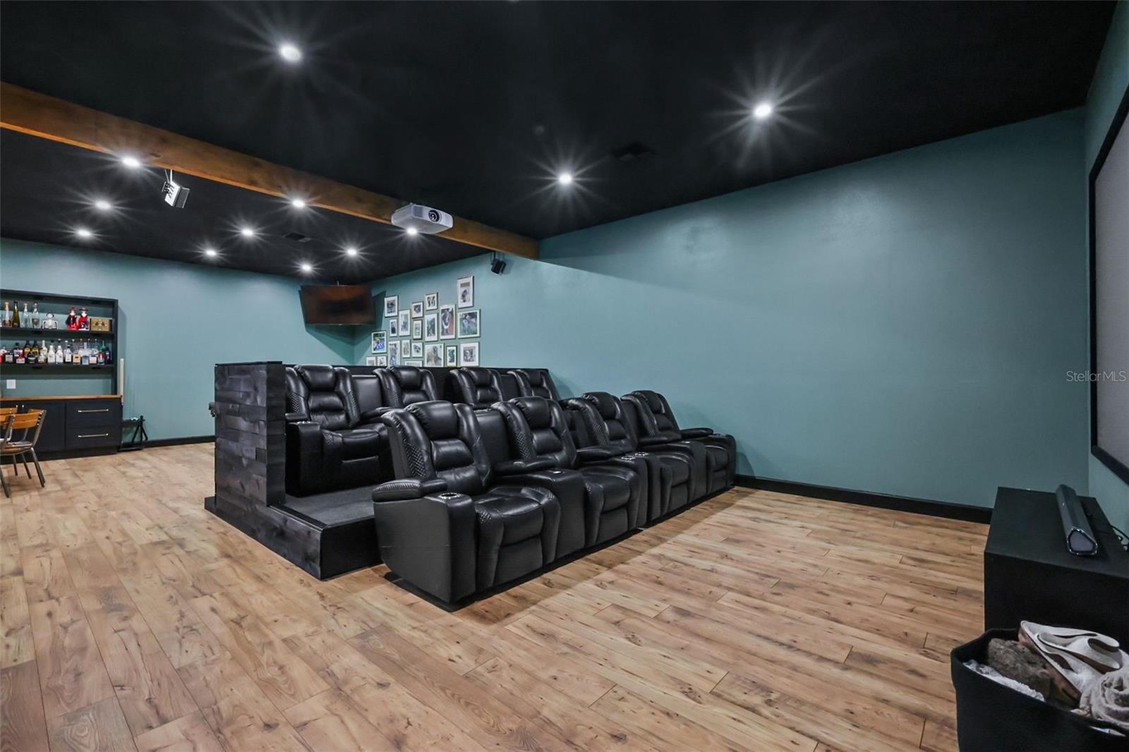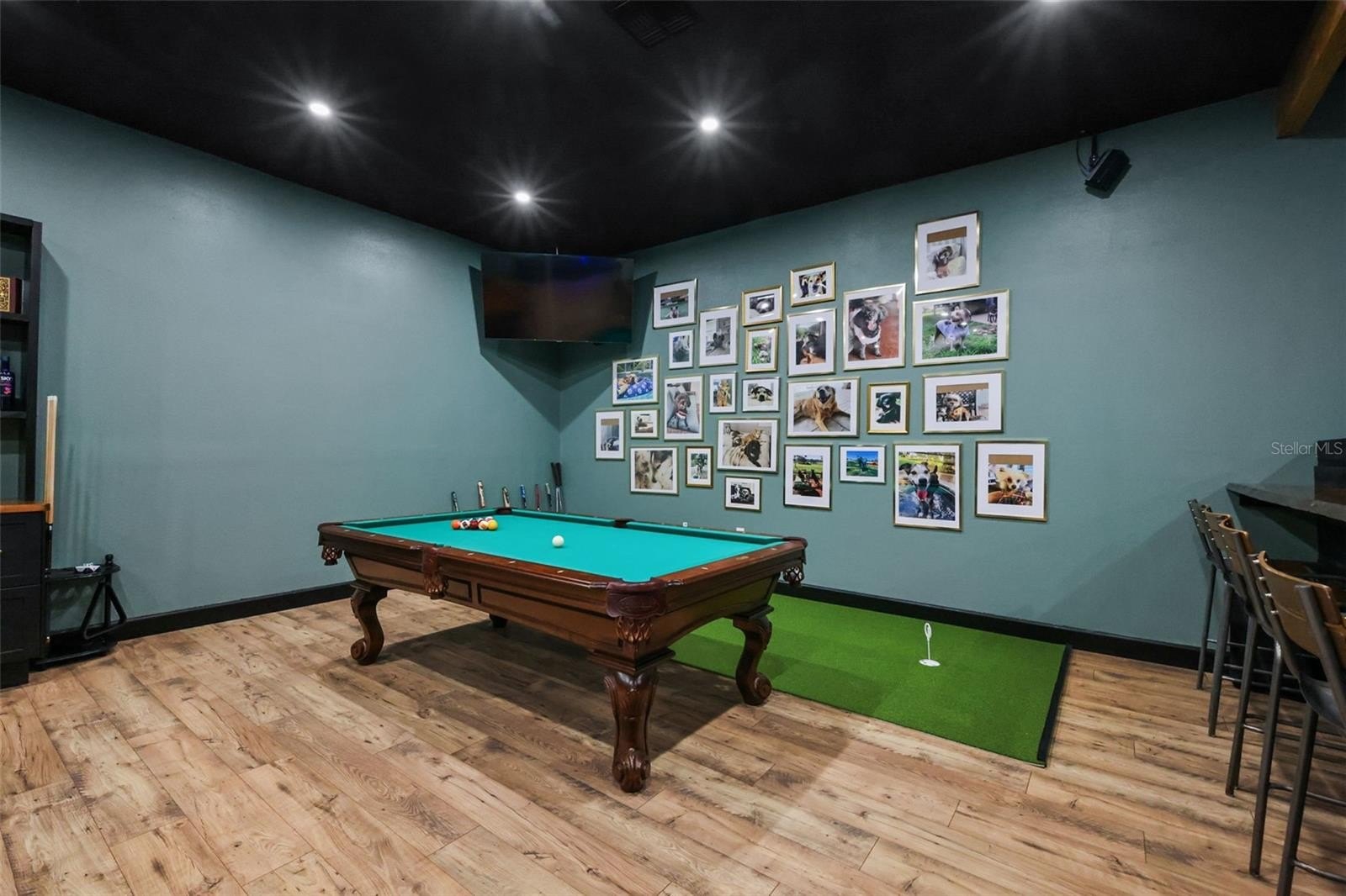 When you step outside, you have a fully fenced backyard with premium ProVista St. Augustine sod, fruit trees and quick access to a newly built 40x50 metal building and attached lean-to. Inside the detached metal building, you'll find dedicated storage space for recreational toys, equipment, and livestock supplies. Walk through a set of double doors and you're welcomed by an additional 1,360 air-conditioned square feet of entertaining space. With a 4K projector and 150-inch screen, you can enjoy sports, tv and movies from the luxurious comfort of the custom-built stadium seating recliners. An additional three 65-inch TVs, built-in bar, pool table, darts, putting green and video games means there's no shortage of ways for you and your guests to enjoy the ultimate entertainment haven. When you want a break from all the excitement inside, just step out to the covered porch overlooking an irrigated garden and fenced pasture complete with top-board and no-climb wire — ready for your livestock to call home. Other deliberate additions to the property include a whole-home generator, electric car charging and RV outlet, asphalt driveways and oversized chicken coop.