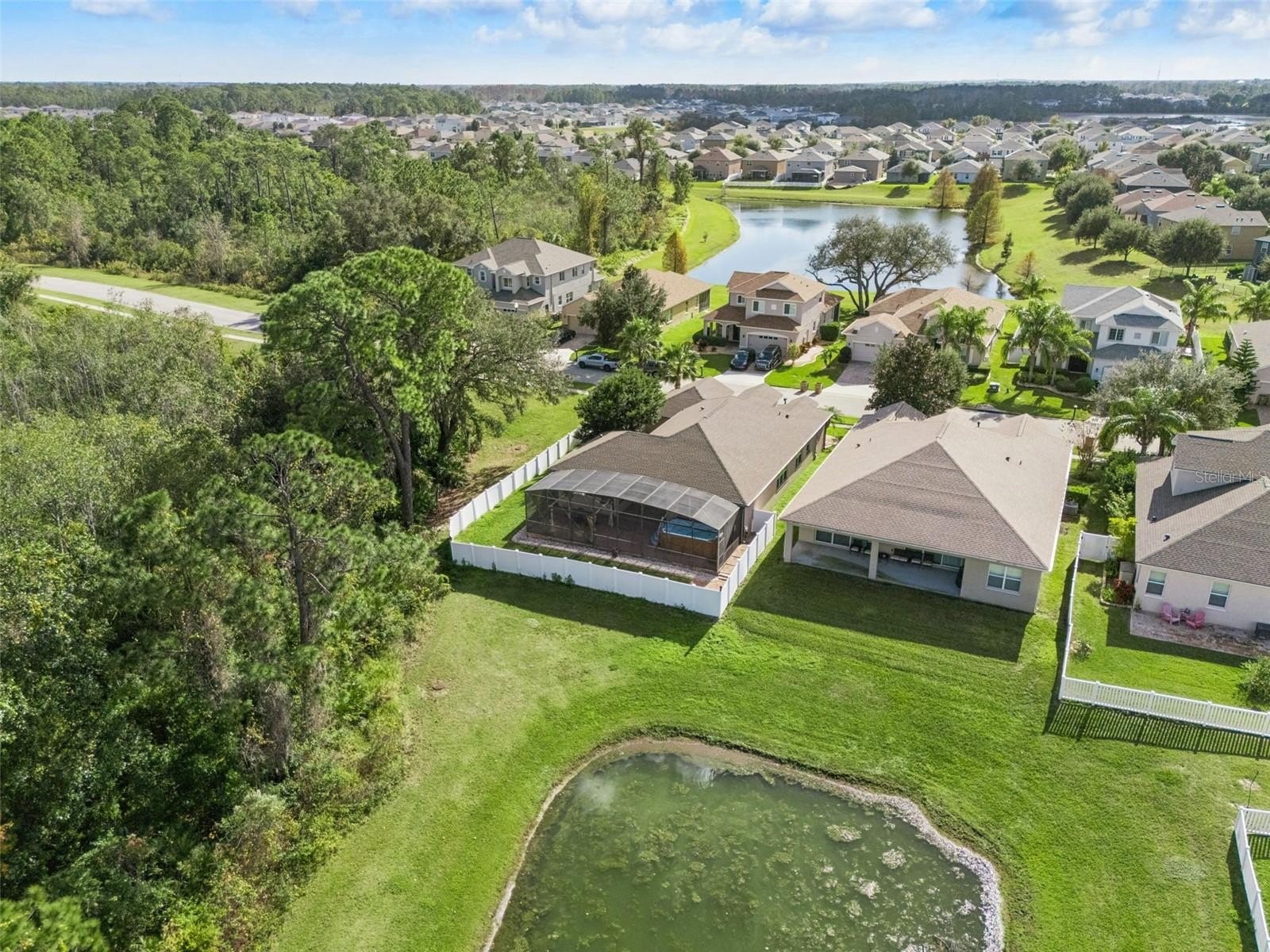 3 bedrooms, 2.5 bathrooms AND a large den (with queen size murphy bed) which can easily be used as a 4th bedroom or office. Outside boasts a private covered and screened large patio/lanai with a SWIM SPA for relaxing year-round! Overlooking a serene pond for stunning water views this home has no rear neighbors and has a conservation area to the right to guarantee privacy and nature. The fully fenced yard and landscaped exterior provide a beautiful and peaceful outdoor space for you to relax and enjoy.