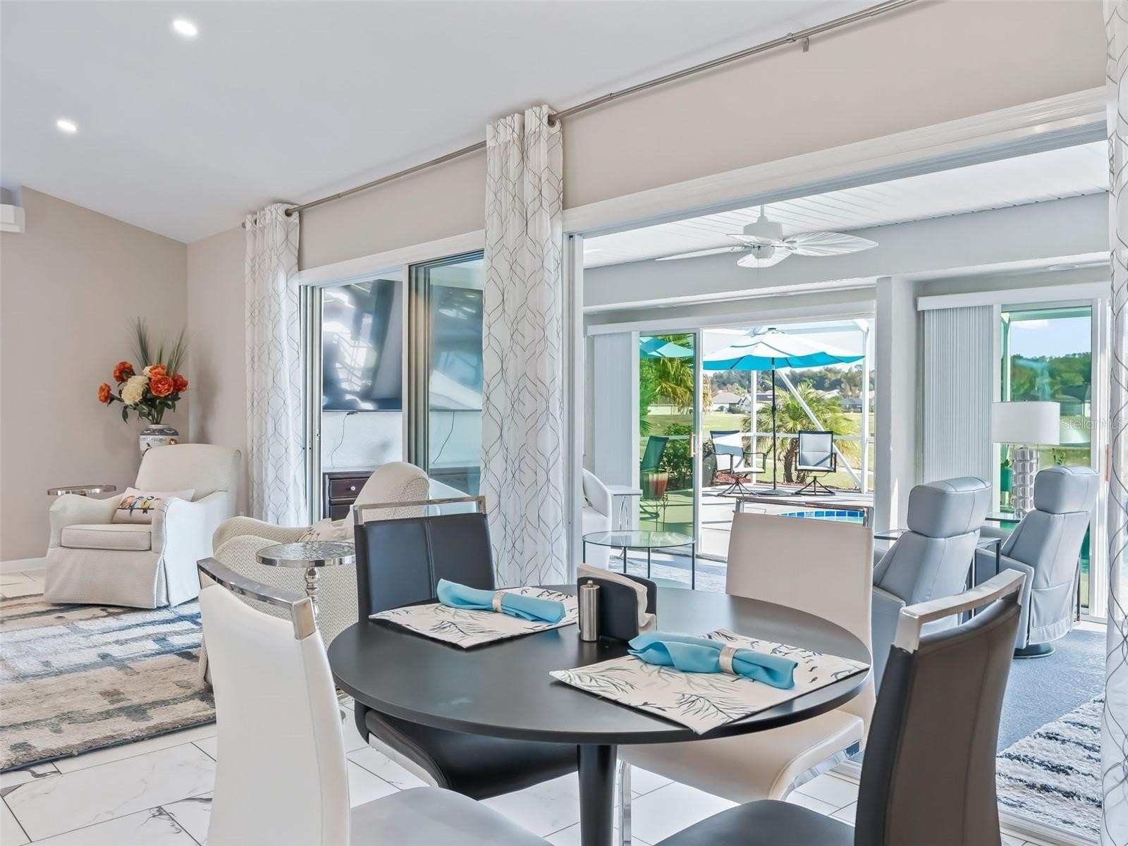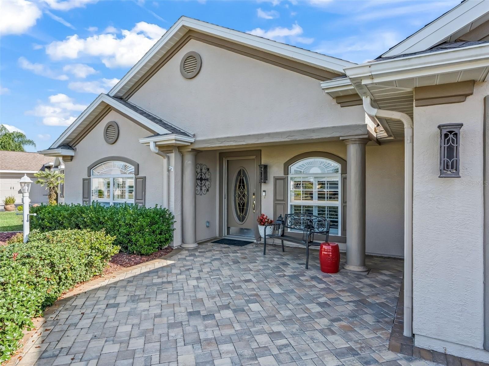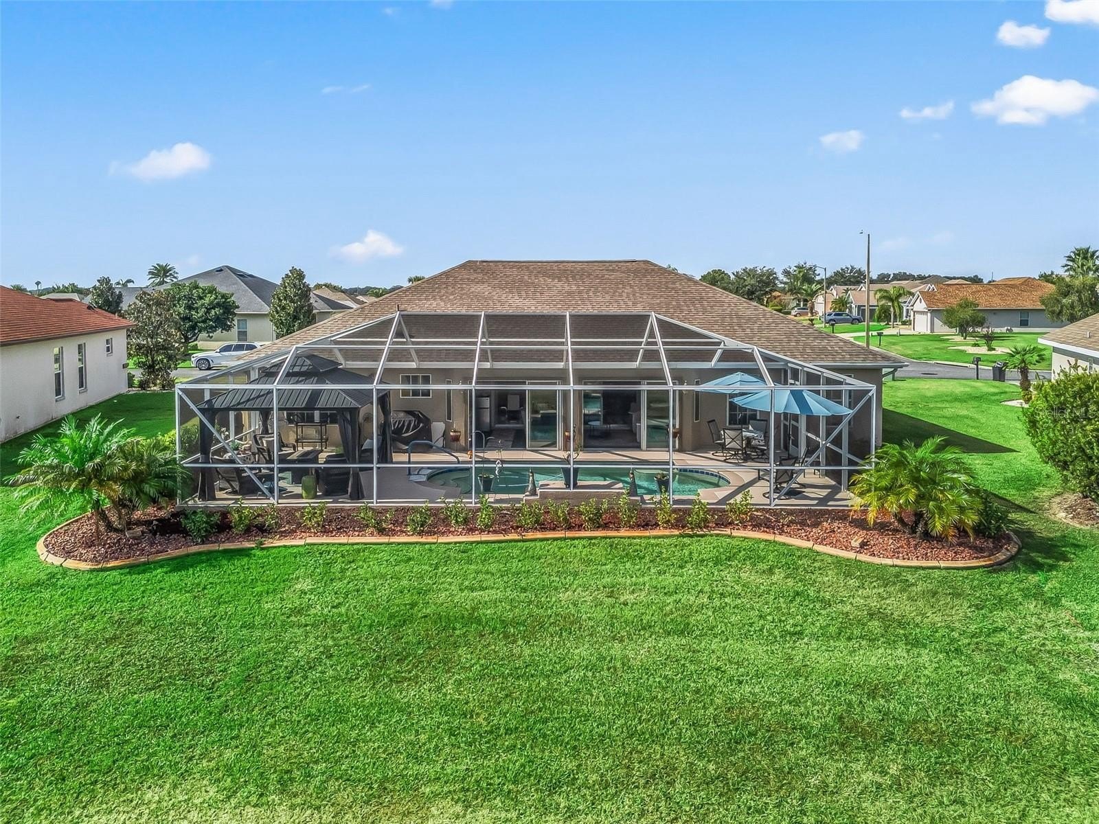 Stonecrest is a 55+ gated golf course community with all the amenities and 4 pools (one indoor), and just a Bridge Away By Golf Cart To The Villages! Come See this Stunning Water Front POOL HOME! 3/3 + Den updated Cedar model with a 2 Car + Golf Cart Garage, ROOF 2022, Vaulted Ceilings, Plantation Shutters, Pool Heater 2022, Pool Pump 2024, No Carpet, No Rear Neighbors, New Lighting & Ceiling Fans, Open Concept, and Split Floor Plan! This Spectacular Home offers Tremendous curb appeal featuring Low Maintenance Professional Tropical Landscaping, Paver Driveway & Walkway, and Covered Front Entrance with an Elegant Leaded Glass Door. This Home Has It All! Exceptional Outdoor Living Space featuring Water Views, a Heated Inground Pool with Water Feature, Enclosed Lanai with Birdcage, Professionally installed Gazebo with a Metal Roof and Accent Lighting, Enhancing the Outdoor Living Experience! You will Love This Open Concept Floor Plan which is Spacious, Light and Bright, just perfect for Entertaining Friends and Family! The Open Updated Kitchen showcases Quartz Countertops, White Wood Cabinetry with Accent Lighting, Stainless Appliances, Generous Breakfast Bar with a Designer Pendant Light Fixture, Pantry Closet, Coffee Bar, an Eat -In Area with a Designer Chandelier, and Stackable Sliders to the Lanai! A Gorgeous Designer Chandelier Adorns the spacious Dining Area which flows to the Huge Great Room featuring Vaulted ceilings with LED top lights, and flows to the Spacious Living area which opens to the 24 x 11 Enclosed Lanai. The Split Floor Plan offers maximum Privacy for both the Owners and their Guest, with the Primary suite commanding one side of the home while the guest bedrooms and guest bathrooms are located on the opposite side of the home. The Luxurious Primary suite boasts a Custom California Walk in Closet, and a New Remodeled En Suite Bathroom showcasing a Huge Tiled Walk in Shower, Private Water Closet, and a Two Sink Vanity featuring Stunning Vessel sinks! The two additional bedrooms feature nice size built in closets. Guest bedroom 2 offers an En suite bathroom with a stunning Tiled Walk in shower, providing your guests with Convenience, and Privacy! Guest bedroom 3 provides a Built in Murphy bed, and is conveniently situated next to the additional guest bath room, which offers Private access to the Lanai, and Pool area. The Enclosed Lanai showcases a Mini Split, Dry Bar, and Insulated Sliding doors providing an Exceptional Additional Living Space, and opens to Your Own Private Oasis! This Gorgeous Tropical Backyard Paradise can be yours! Call now for a private showing. The pool is maintained weekly by "Backyard Pools", HVAC 2016 with UV light for germ eradication. Stonecrest is a 55+ gated golf course community with all the amenities, pools, pickleball courts, softball, 18 hole championship golf course, Broad Stripes Golf & Social Club and over 80 different clubs to join! As a private gated golf course community, you can expect a high level of privacy and security. Overall, this home offers a combination of Exceptional Outdoor Space, Luxurious Features, a Fantastic Location, and a Secure Community Setting. A WONDERFUL LIFESTYLE AWAITS YOU IN STONECREST!