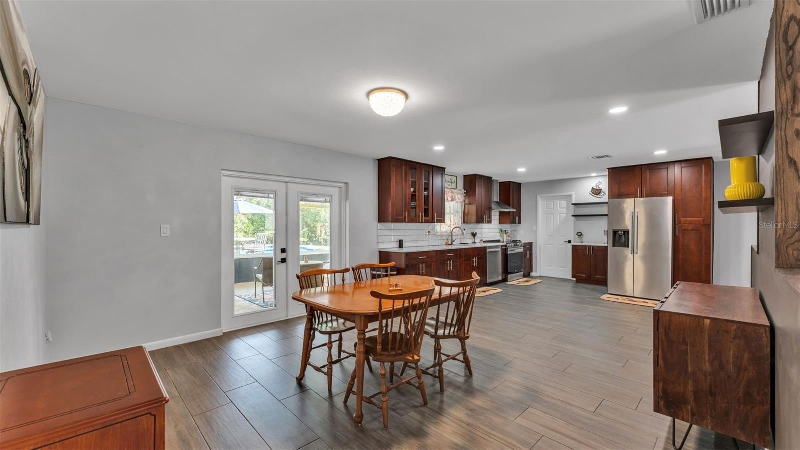 Don't miss out on this Beautiful single-family home in a very desirable part of south Lakeland. This home features 3 bedrooms and 2 baths with an open floor plan, large recently remodeled eat in kitchen with stainless steel appliances and dark wood cabinets, a spacious living room, wood look tile throughout the home, recessed overhead lighting, stylish ceiling fans, a separate bar area, upgraded backsplash and range hood. The guest and primary bathroom have also been recently updated, new paint in the bedrooms, a large screened in porch area leading out to the remarkably landscaped back yard with a large pool area with a recently updated pool and so much more! Seeing is believing with this exceptional south Lakeland home!