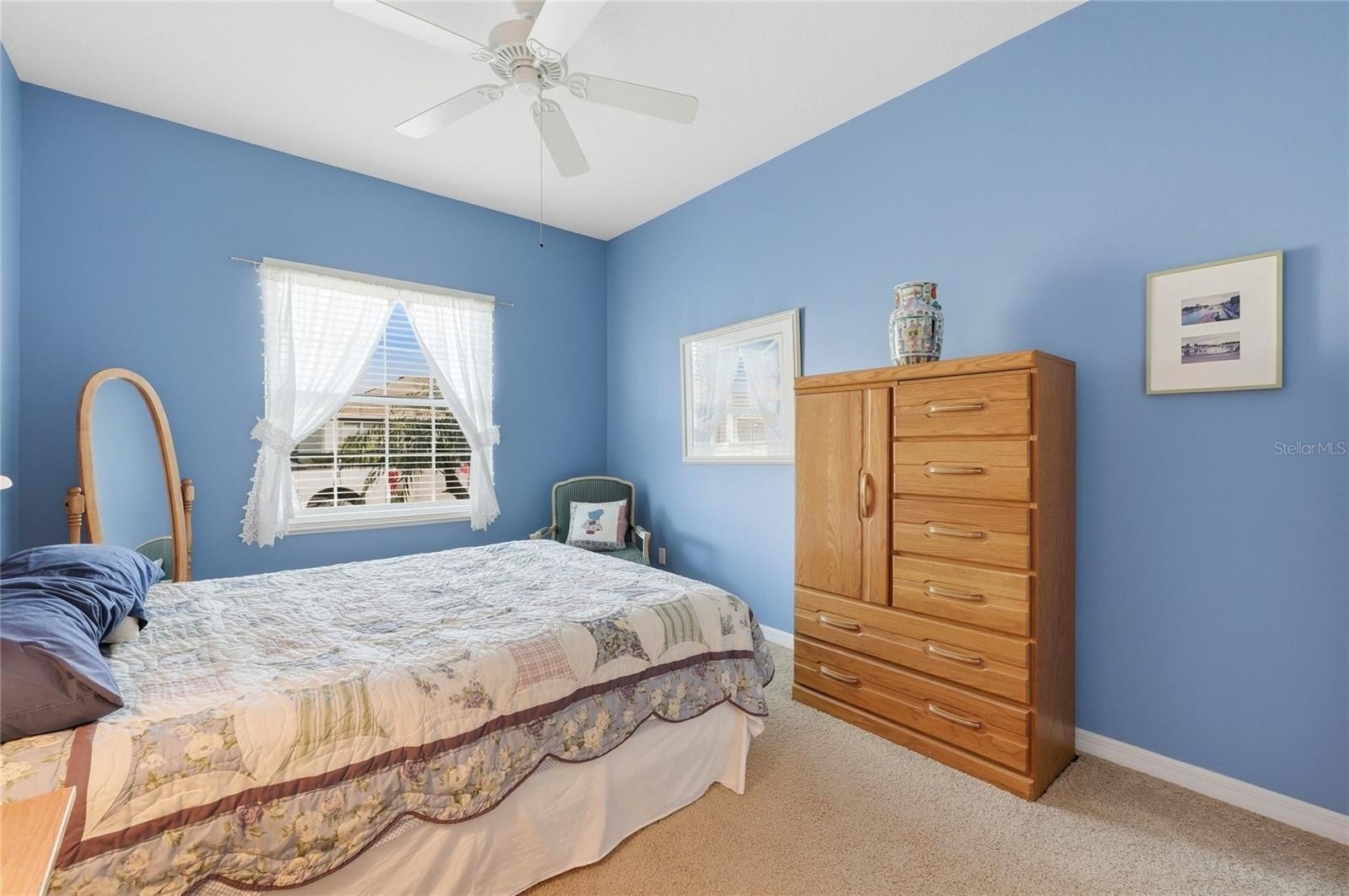 The guest bedroom is generously sized with ample closet space and easy access to a full guest bath. The den/office features beautiful glassed French doors and can easily flex into another bedroom or game room. Privately positioned at the rear of the home, the primary suite features sliding glass doors leading to the screened lanai, a spacious walk-in closet, and a luxurious en-suite bath with dual vanities, a soaking tub, tiled walk-in shower, and a separate water closet.