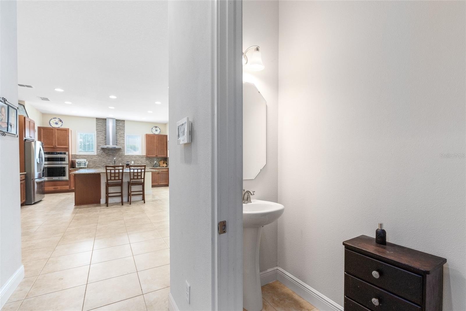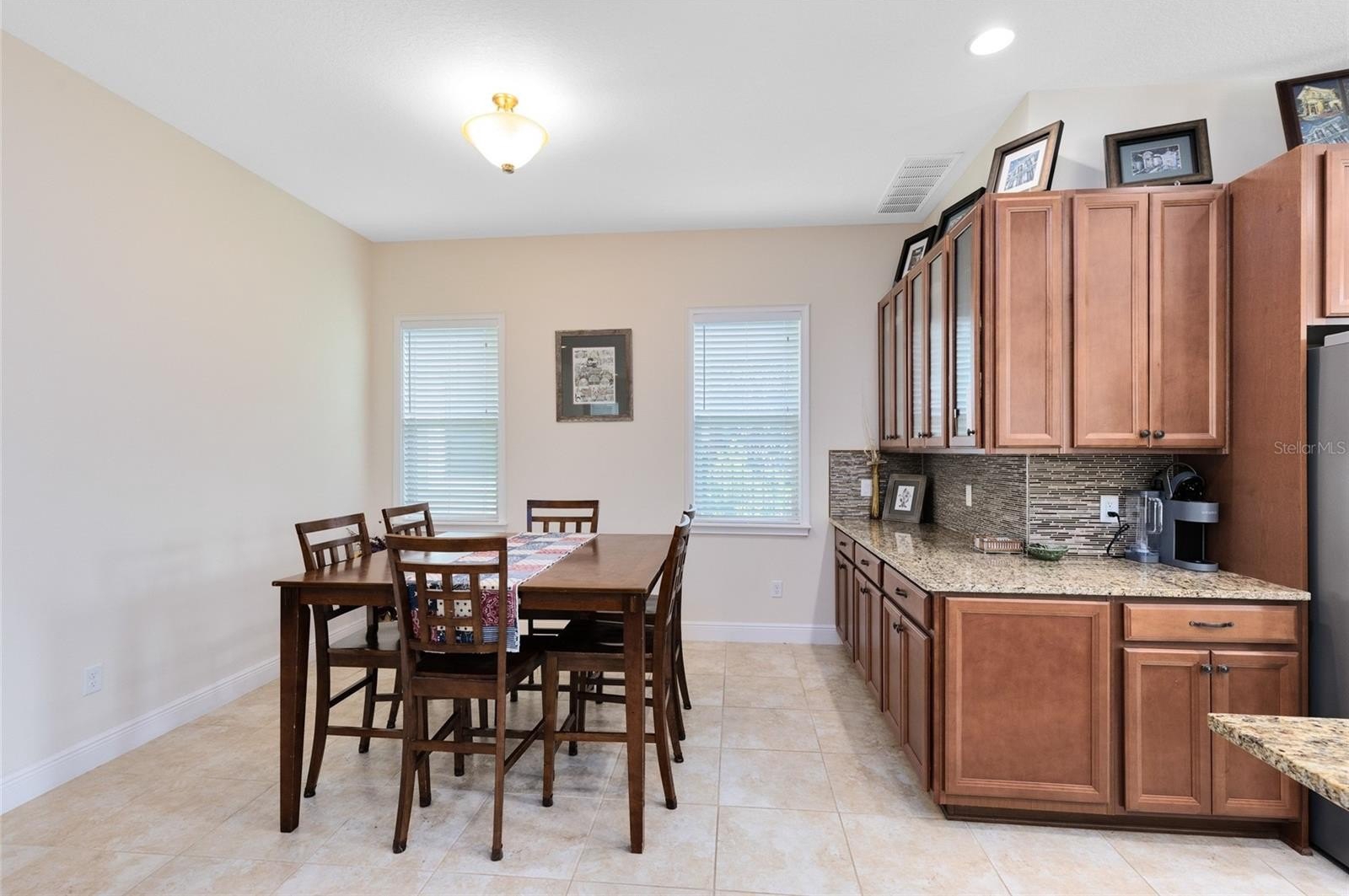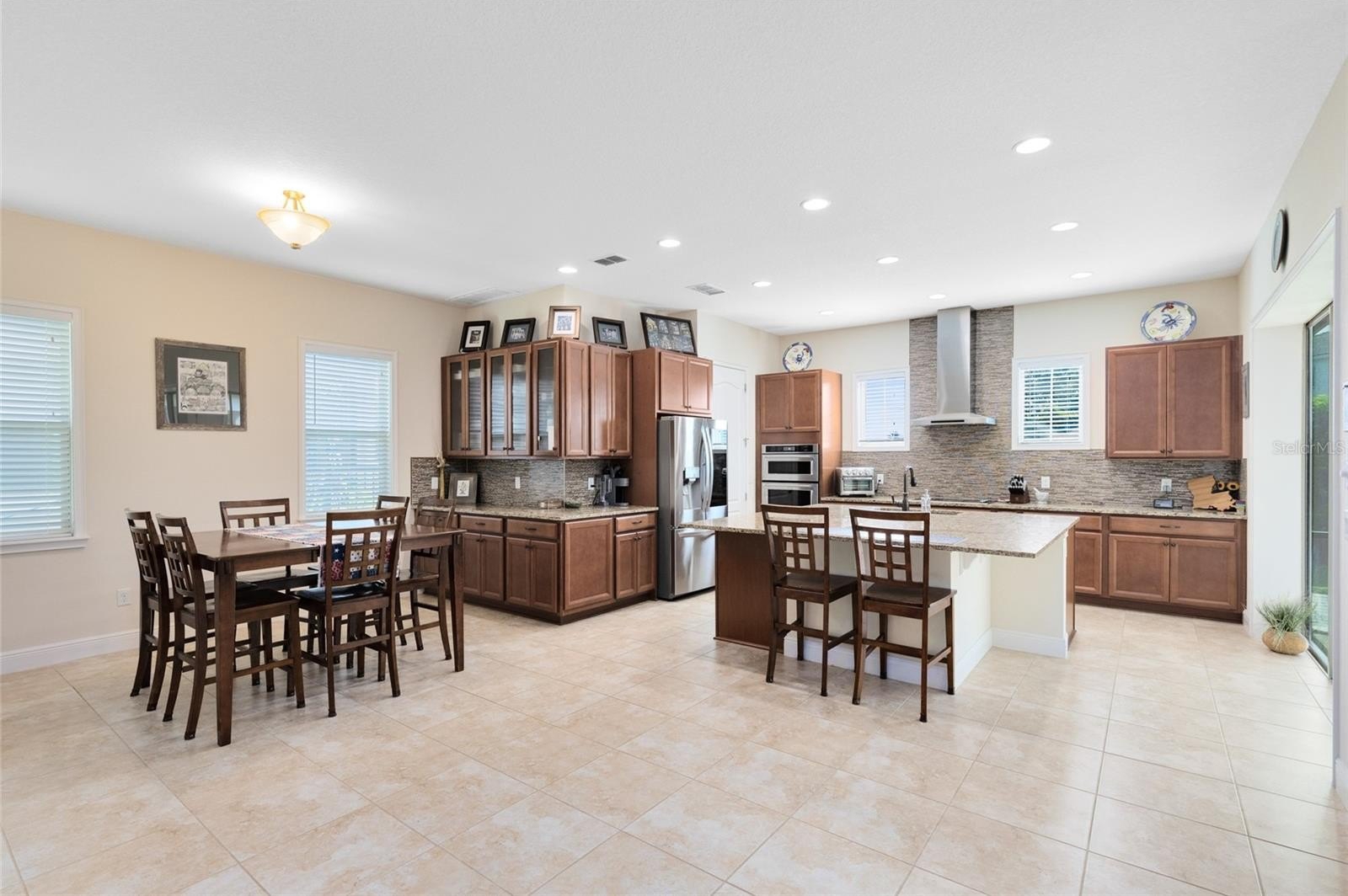 From the moment you arrive, the Mediterranean-inspired exterior, tile roof, paver driveway, and lush landscaping make a striking impression. Step inside to a bright, open layout where the great room flows into the dining space and chef-style kitchen. Enjoy granite countertops, rich wood cabinetry, stainless steel appliances, designer backsplash, and a spacious island perfect for entertaining.