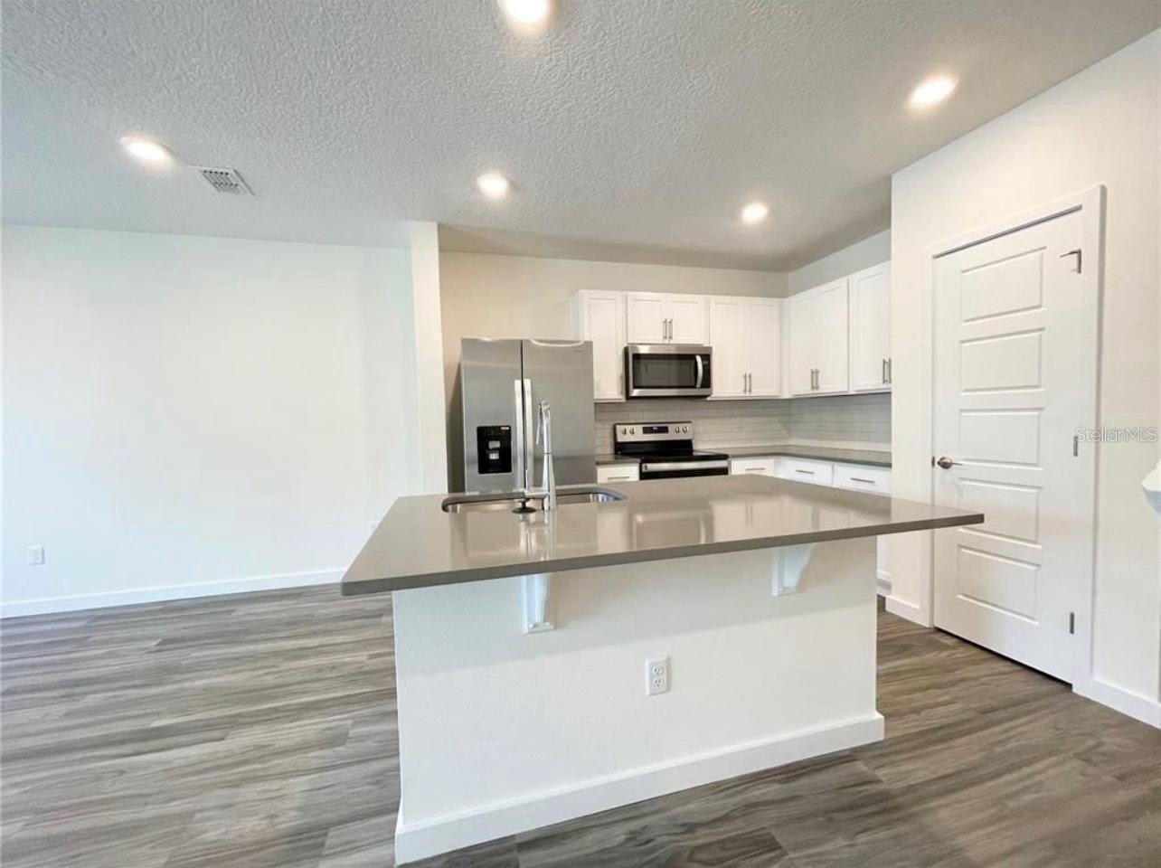 Inside, the open-concept living area creates a bright, welcoming atmosphere—perfect for entertaining or relaxing. The modern kitchen is outfitted with quartz countertops, sleek stainless steel appliances, and generous counter space that makes cooking a pleasure.