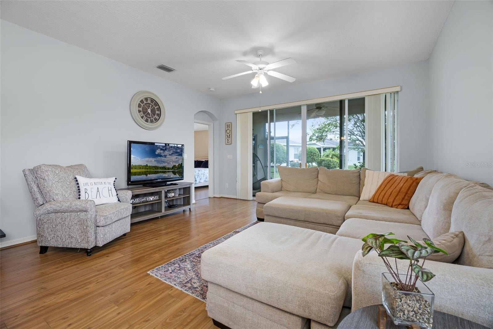 The luxurious primary suite is a private retreat, complete with direct access to the screened patio, a large walk-in shower, and a soothing garden tub. Two additional bedrooms and a full bath offer plenty of space for guests or hobbies. Enjoy easy-care laminate flooring throughout the main living areas and bedrooms, and rest easy with a roof replaced in December 2019.